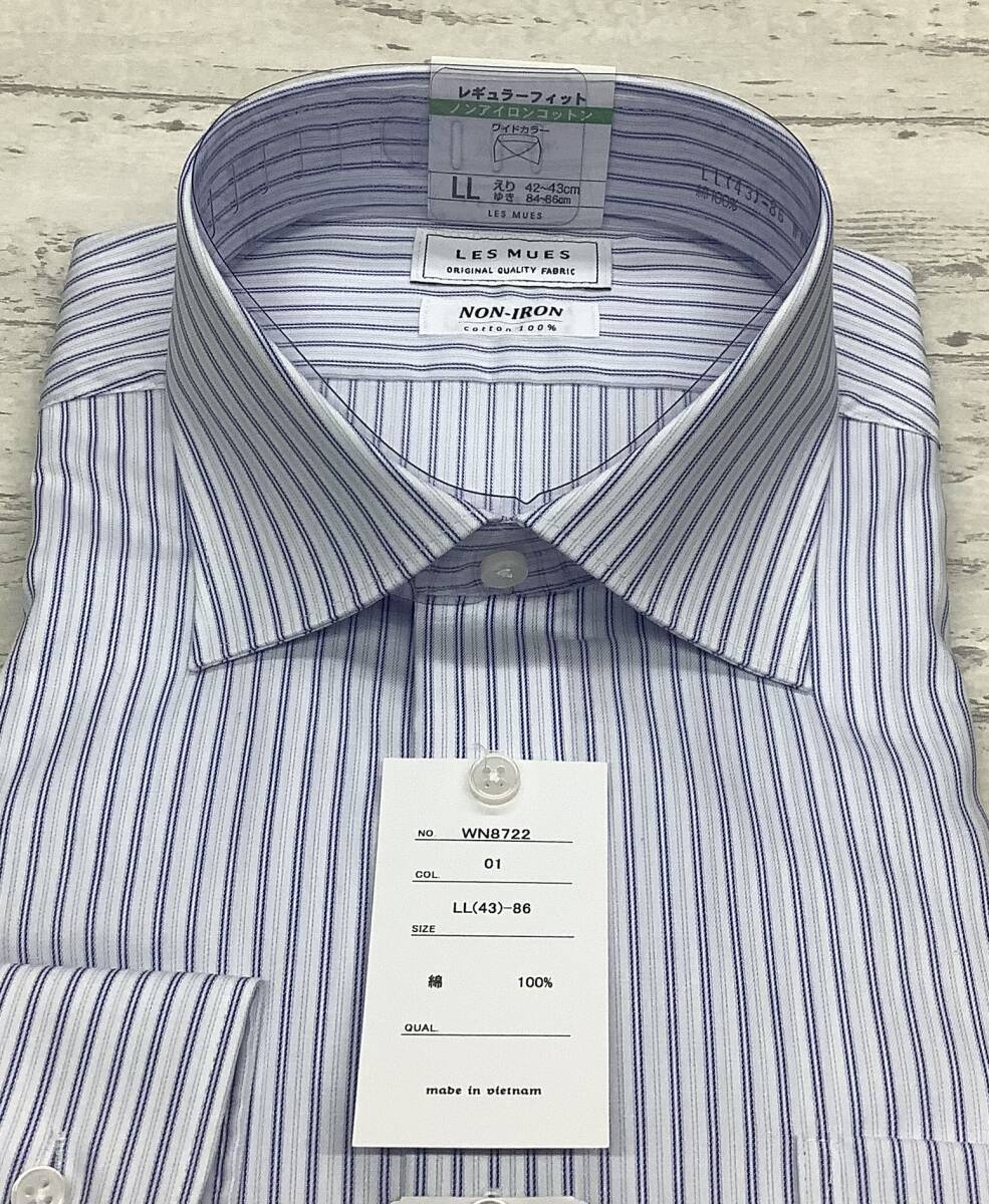 ★43-86 LLサイズ 定価4,990円の品★綿100% ワイドカラー★ノンアイロンコットン ブルー系ライン ストライプ柄