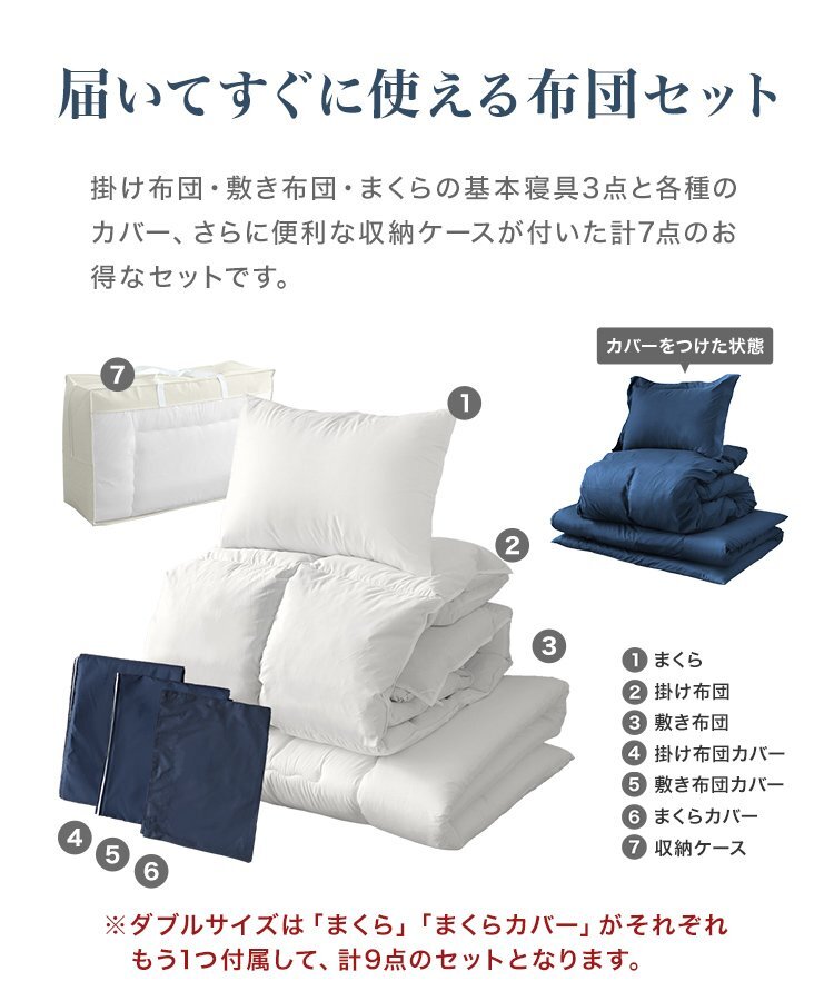 届いてすぐ使える寝具8点+収納ケースの9点セット! この布団には抗菌防臭生地を採用! 掛け布団は高級布団などにも使われるフェザーを100%使用しているので、 冬場は暖かく、夏場は蒸し暑くなりにくいため、オールシーズン快適に過ごすことができます! 敷き布団はフローリングや畳の上に直接敷いても痛くないよう、芯のある固綿を、 ふんわり柔らかな中空ポリエステル綿でサンドイッチした三層式構造を採用! 底付き感を感じないボリュームで、快適な寝心地とふんわり優しく包みこまれる気持ちよさを実現! 枕は中空ポリエステル綿を使用! ボリュームがあるので、しっかりと頭部を支えてくれます! \各種カバー付き!/ カバーは洗濯機で丸洗いができるので、とっても衛生的! 万が一、汚れてしまった時や何かこぼしてしまった時も安心です! すぐ使えるから、こんな方におススメ♪ ・新生活を始める方 ・来客者用の布団一式を考える方 ・布団・寝具の買い替えを考える方 ・社員寮など業務用として考える方 【商品内容】 掛け布団・敷布団・掛け布団カバー・敷布団カバー・まくら×2・まくらカバー×2・収納ケースの9点セット カラー:ベージュ サイズ:掛け布団、掛け布団カバー:W190×H210 敷き布団:W140×H200 敷き布団カバー:W145×H205 まくら:W63×H43 まくらカバー:W72×H53 収納ケース:W120×H65×D35 素材:ポリエステル、フェザー |
