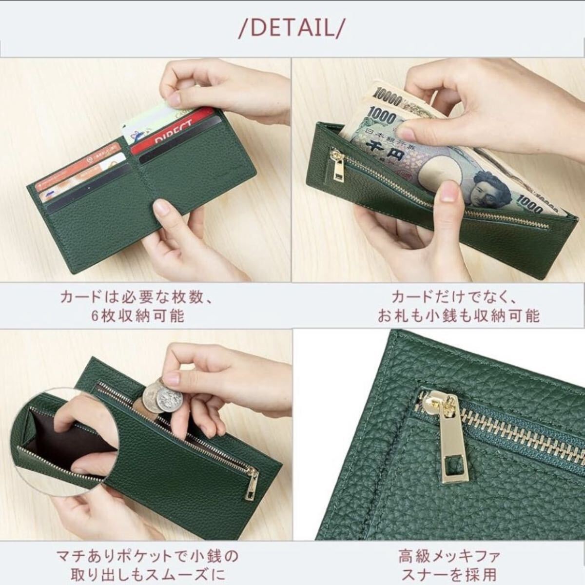 収納力は、カード6枚に加え、コイン、紙幣、カード、レシートなどを一目瞭然して、3ヵ所のお札入れも大きく開く取り出しやすいです。