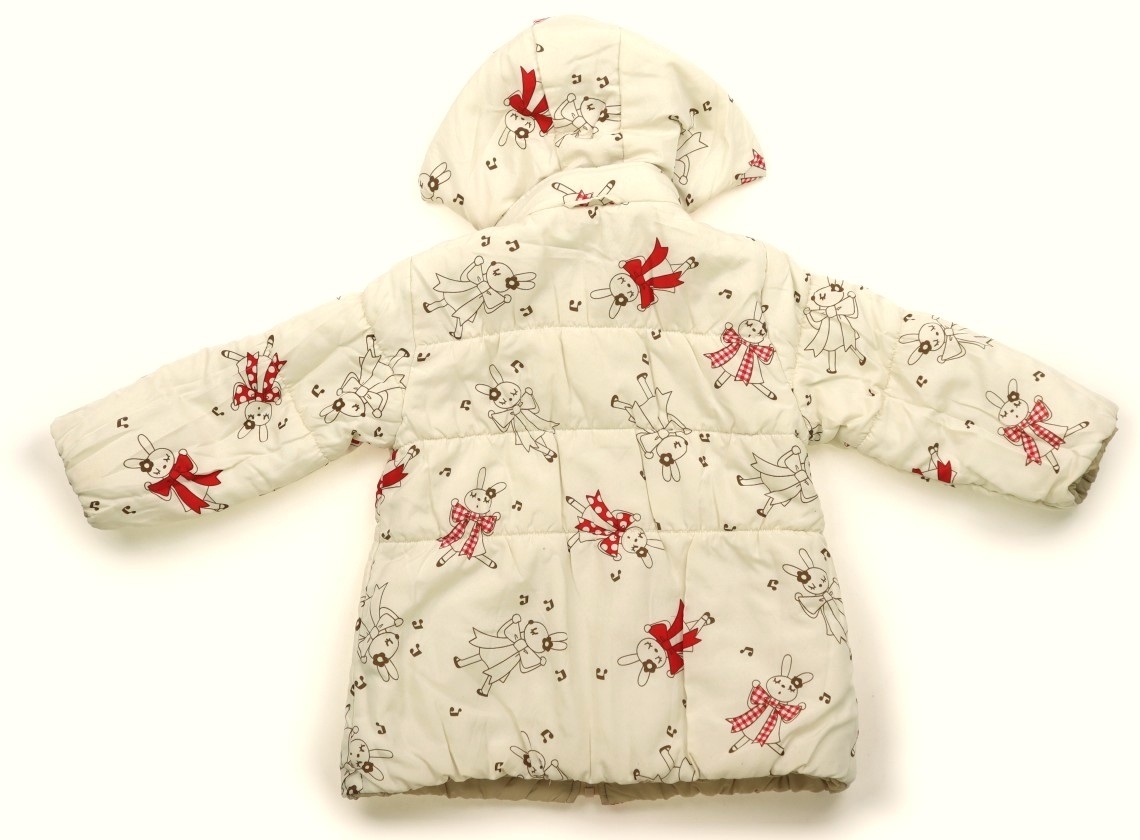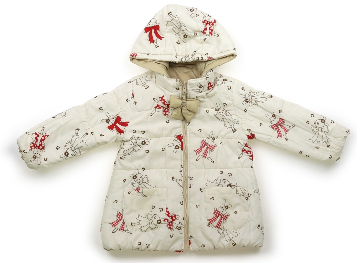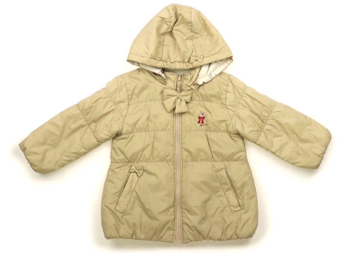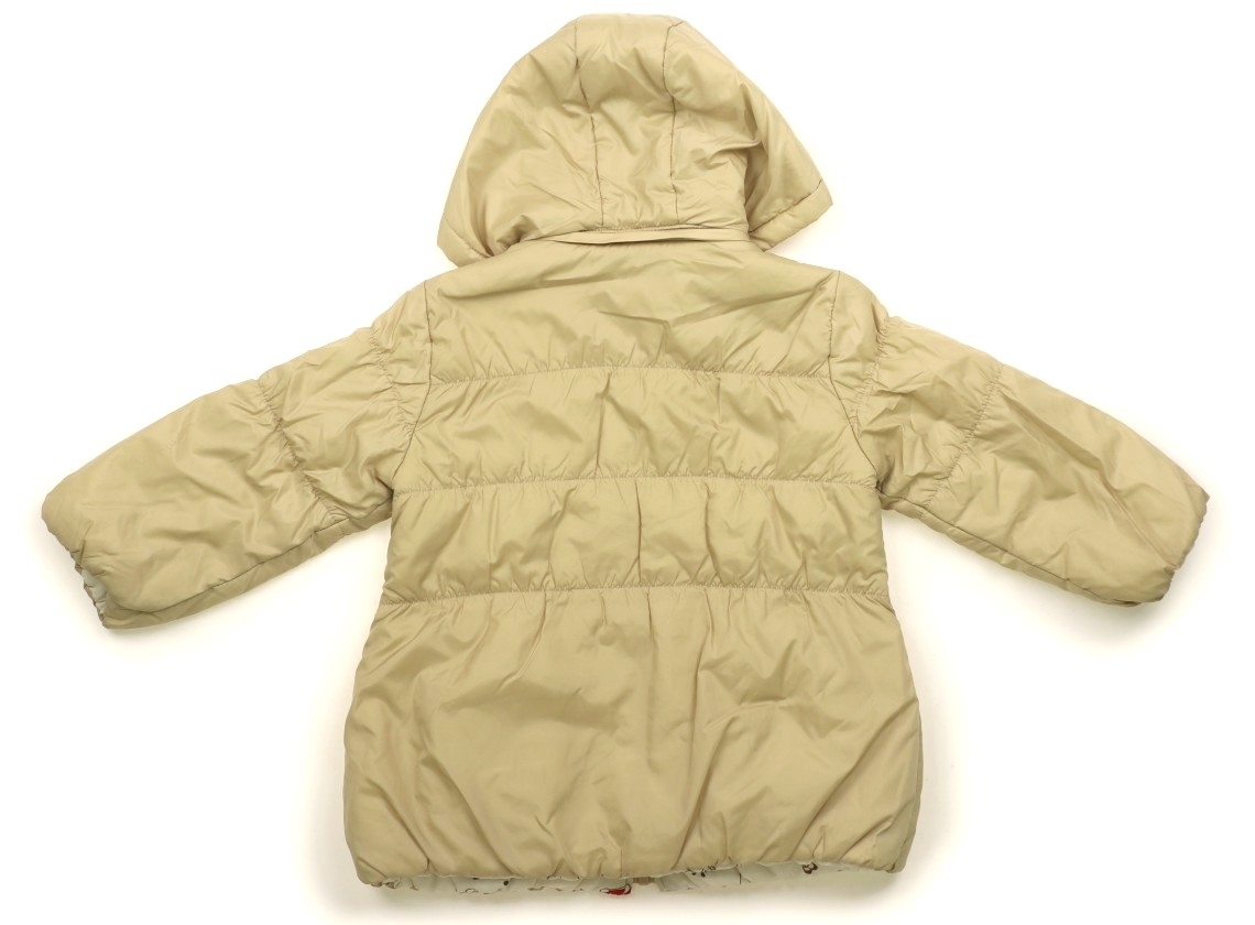ジップリボンの型崩れあり。リバーシブルで着られます。表地・裏地・中綿すべてポリエステル素材です。フードの取り外しが可能です。左ポケットのリボンが欠損しています。所々に薄汚れがあります。普段使いにいかがでしょうか。