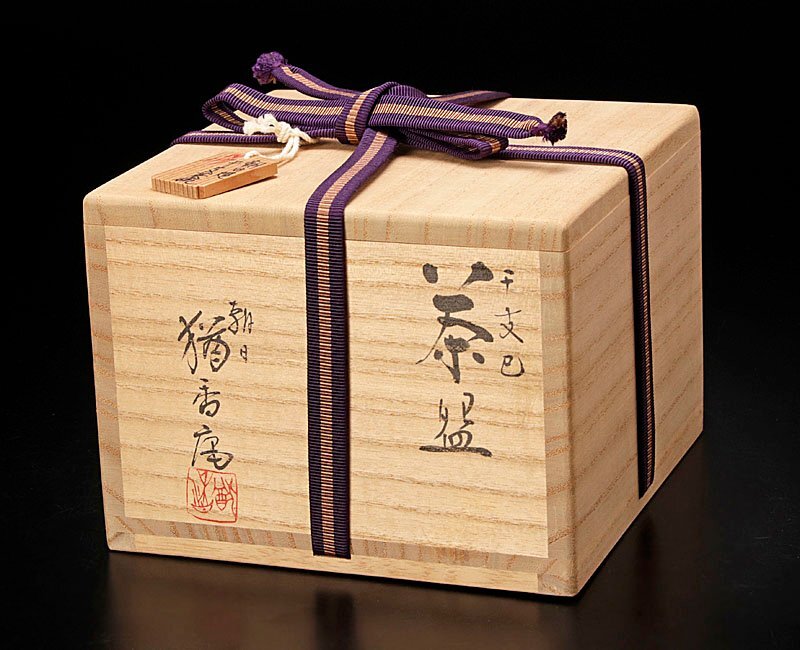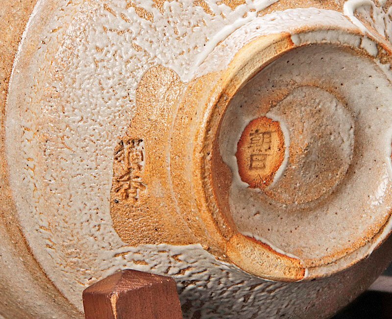 【十四代朝日豊斎】 朝日焼14代。称号:本名松林豊斎/号猶香庵。遠州七窯の一つ朝日焼を継承。京都第二工校陶磁器科卒。京都国立陶磁器試験所修了。師事:楠部彌弌。昭和22年(1947)、先代没後、十四代を襲名。日展、日本工芸美術展入選。伝統の御本手の偶然性、窯変美を科学的に研究分析。昭和27年(1952)、登り窯築窯。昭和33年(1958)、倒式平地窯、重油と松割木混焼窯築窯。昭和40年(1965)、シャトルLP窯築窯。昭和46年(1971)、登り窯を無煙化。昭和50年(1975)、この登り窯に穴窯を併設した無煙窯を築き、土と炎の変化を追究。(玄窯)。平成7年(1995)、名跡を十五代に譲り猶香庵を名乗る。京都伝統陶芸家協会会員。 |