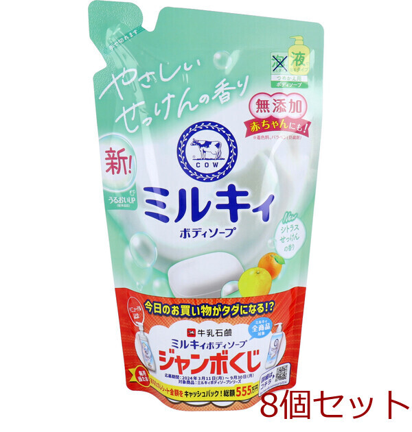 赤ちゃんから大人まで家族みんな心地いい。 110年以上やさしさにこだわってきた牛乳石鹸の「やさしいせっけんの香り」のボディソープ。 ・クリーミィな泡でうるおいを守り、すべすべ肌に。 ・赤ちゃんから大人まで家族みんなで心地よく使えます。 ・シトラスせっけんの香り。 ・無添加(着色料、パラベン(防腐剤)) ・皮ふアレルギーテスト済み・敏感肌の方によるパッチテスト済み。 ※全ての方にアレルギー・皮ふ刺激が起こらないということではありません。 ・シアバター・スクワラン配合(うるおい成分) ・ラベルを取ると、シンプルボトルに。 個装サイズ:130X230X60mm 個装重量:約377g 内容量:350mL 製造国:日本 【発売元:牛乳石鹸共進社株式会社】 【化粧品】 ボディ洗浄料 販売名:ミルキィボディソープCTe 【成分】 水、ミリスチン酸K、ラウリン酸K、パルミチン酸K、塩化K、コカミドMEA、ジステアリン酸グリコール、パルミチン酸、シア脂、スクワラン、コカミドメチルMEA、コカミドプロピルベタイン、PPG-75、PPG-9M、PPG-45M、ポリオクタニウム-6、グリセリン、香料、EDTA-2Na 【つめかえ方】 ・必ず「ミルキィボディソープシトラスせっけんの香り」のポンプボトルに1回で全量をつめかえてください。 ・つめかえる前にはボトルの中とポンプ部分を水道水でよく洗い、よく乾かしてからつめかえてください。 ・他の製品や水と混ざらないようにしてください。 ・中身をつめかえた後、パックの製造番号を記録しておいてください。 (1)注ぎ口を開ける:パッケージの矢印の方向に向かって切り取ってください。 注ぎ口が閉じているときは、注ぎ口の両端をつまんで広げてください。 (2)ボトルに注ぐ:注ぎ口をボトルの口の中に差し込み、中身をゆっくり出してください。 【ご使用方法】 ※この商品は液体タイプです。 泡タイプの製品をつめかえないでください。 ・つめかえ後は、お湯を含ませたタオルやスポンジなどに適量を出し、よく泡立ててから洗い、あとはよくすすいでください。 【ご注意】 ・お肌に異常のある時や異常が現れた時は、使用しないでください。 ・赤ちゃんに使用する場合は、ご家族の方がお肌の状態を見ながら、ご使用ください。 ・目に入った時はすぐに洗い流してください。 ・乳幼児の手の届かないところに保管してください。 ・高温又は低温になる場所や直射日光のあたる場所に置かないでください。 ・環境を考えた薄い材質のため、持ち運びや保管場所にご注意ください。 ・注ぎ口が手で切りにくい時は、ハサミで切り取ってください。 注意事項 ※予告なく成分・パッケージが変更になることがございます。 予めご了承ください。 *予告なく成分・パッケージが変更になることがございます。予めご了承ください *ダンボールを使用して発送する場合には、入数以下の個数の場合、 中古ダンボールを使用する場合があり、ご注文の商品とは異なるダンボールになる場合があります。 あらかじめ、ご了承ください。 |