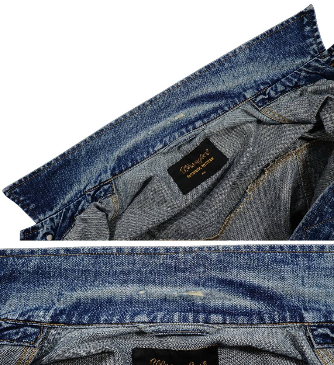 備考 Wranglerのデニム素材、トラッカージャケットです。濃い目のカラーからの色落ち具合いが抜群に良い雰囲気になっていると思います。クリーニング、プレス済。