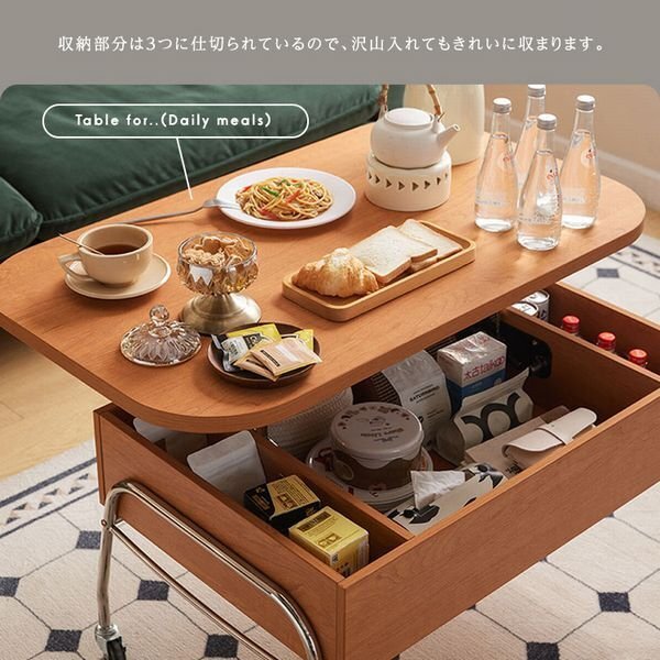 | キャスター付きリフティングセンターテーブル! 360度回るキャスター付きなので楽に移動させることも可能です。 もちろんストッパー付です。 天板下の収納も大容量で使いやすくなっています。 |
