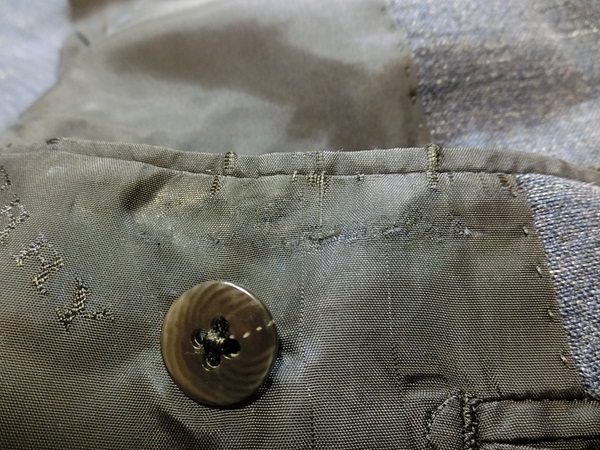 | 状態 | 多少の使用感はありますが、生地等はしっかりしてまだまだご着用いただけます 襟ぐりに薄シミ有、左ポケット下に擦れ色落ち有、左内ポケット付近に刺繍痕有 着用にあたり気になるダメージ等はないと思います |