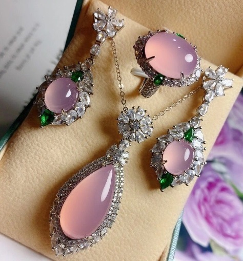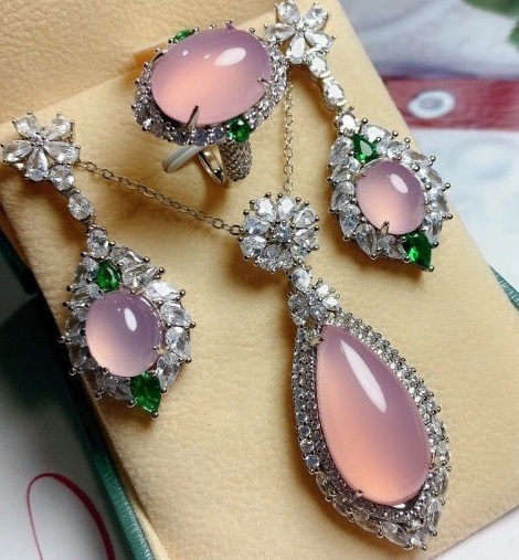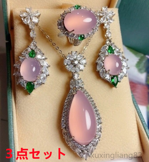 ジュエリー3点セット ブラジル産 天然玉髄 ネックレス ピアス リング 満々ジルコン メッキ アクセサリー