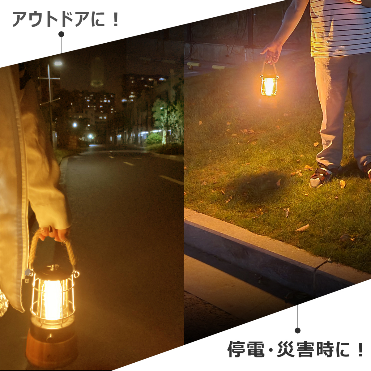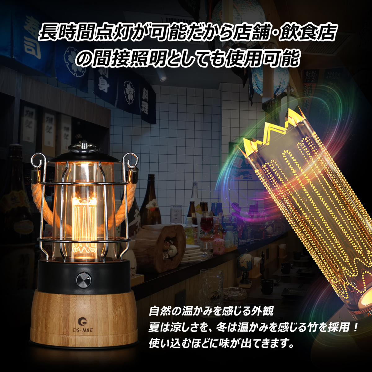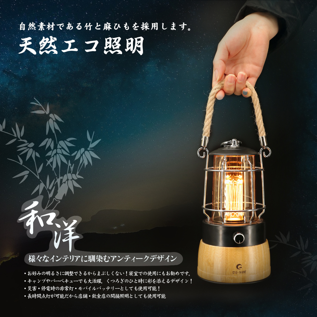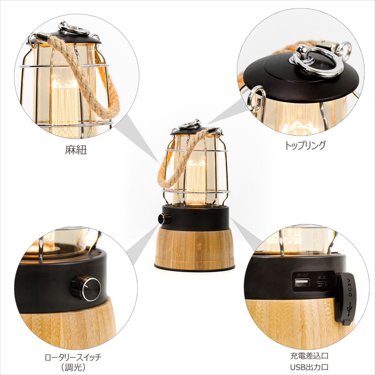 ポイント1:【最新技術とレトロの融合】 ◎実用新案登録、LED発光式フィラメントです。 ◎特殊なレーザー加工を施すことで美しい光の屈折を実現しました。 ◎発光部分は豆電球のフィラメントを演出します。 ◎明るさを調節できるあらゆるシーンに大活躍できる! ◎全光束10lm~400lmまで、ロータリースイッチ一つで無段階調光できます。 ポイント2:【クラシック&モダン】 ◎クラシックのデザイン:持ち手部分には麻紐を使っています。ランタンのボディには竹を採用します。 ◎USBポート搭載、万が一の場合、スマホ、携帯などに充電できます。モバイルバッテリーとして使用可能です。 ◎大容量充電池1本付属の充電式ランタンですが、乾電池(別売り)も兼用できます。生活の便利さを向上する上に、停電や防災にも適合です。 ◎くつろぎのひと時に彩りを添えて、疲れた心身を癒します。 ポイント3:いろいろなシーンで大活躍! ◎キャンプ、バーベキュー、パーティー、車中泊、小旅行、アウトドアに最適のデザインで、快適にご利用になれます。 ◎クラシックの上に、発光色は電球色で、玄関、家庭、店舗など、装飾用品として、更に雰囲気作りに大いに役立てます。 ◎連続点灯時間は80Hもできますので、停電や災害時の非常灯として安心で心を癒します。 ◎寝室、夜間授乳などもオススメです。 ◎長時間点灯できますので、店舗や飲食店の間接照明としてもいいです。 |