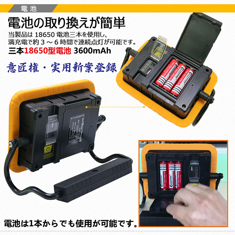 | セット内容 | 投光器本体、18650型充電池(品番:LDC-361A)*3本、AC充電器、取扱説明書、保証書 | ||