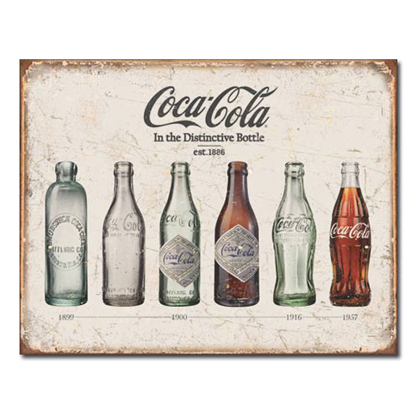 炭酸飲料水 コカコーラのティンサイン(ブリキ看板)。1899年のボトルから1957年までのボトルが描かれています。