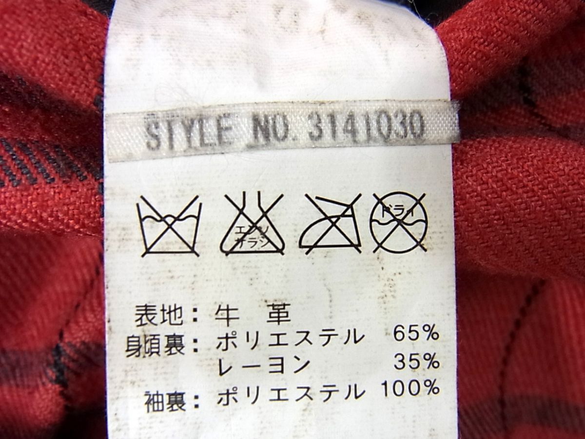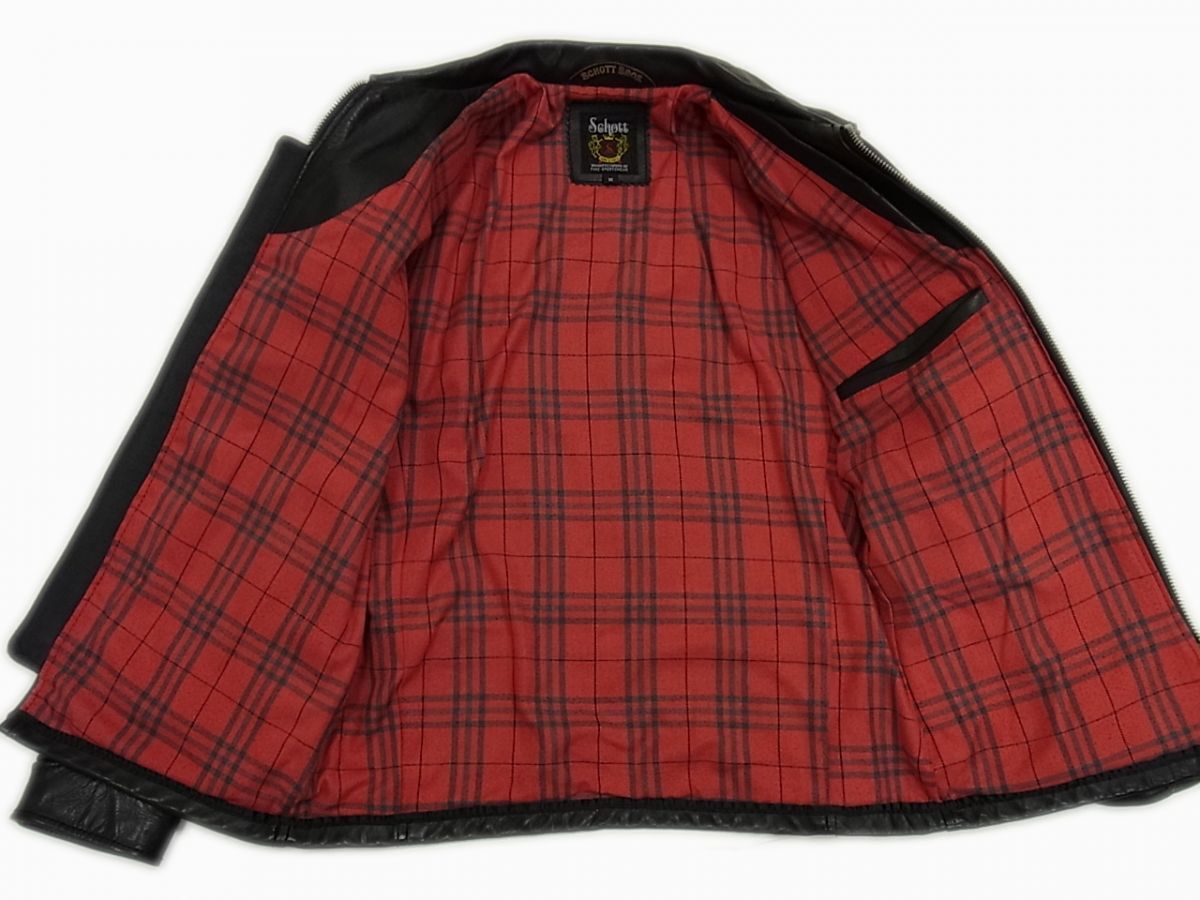 表革は柔らかなカウハイドレザー(牛革)、裏地はチェックのフランネル素材。ポケットには全てジッパーが付き、フロントジッパーはSchottの刻印入り、ウェスト両サイドにアジャスター、内ポケットを1個装備したクラシカルなレザージャケットです。このトラッカーデザインは昔からありますが、ジッパーの仕様やサイジングなどは今の時代に合わせてあり、昔のものより細身で丈もショートです。定価は81,400円【(株)上野商会】の正規品です。