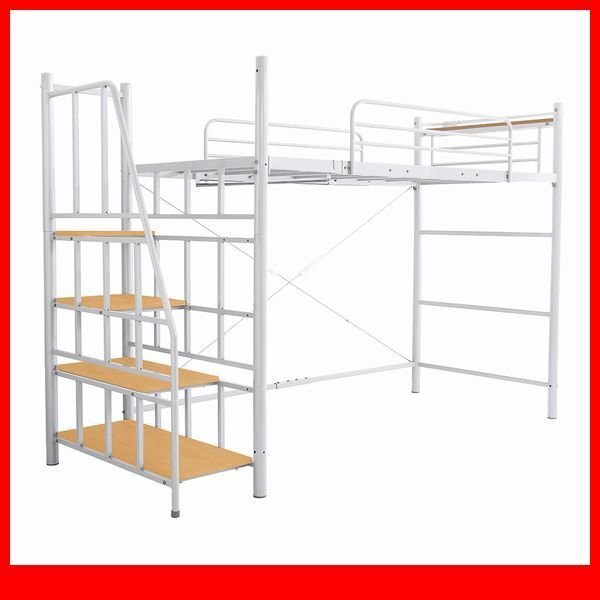 | 【ポイント】 ①階段付きでより快適にご使用頂けるロフトベッドです。 ②コンセント付きの宮棚が付いて、ハイタイプ・ミドルタイプに高さ調整ができます。 ③丈夫なパイプを使用しているので安心、安全です。 ④ベッド下のスペースはお好みでアレンジが可能です。 |