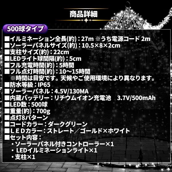 ソーラー イルミネーション 屋外 クリスマス ストレート 屋外用 イルミネーションライト 500球 ゴールド×ホワイト