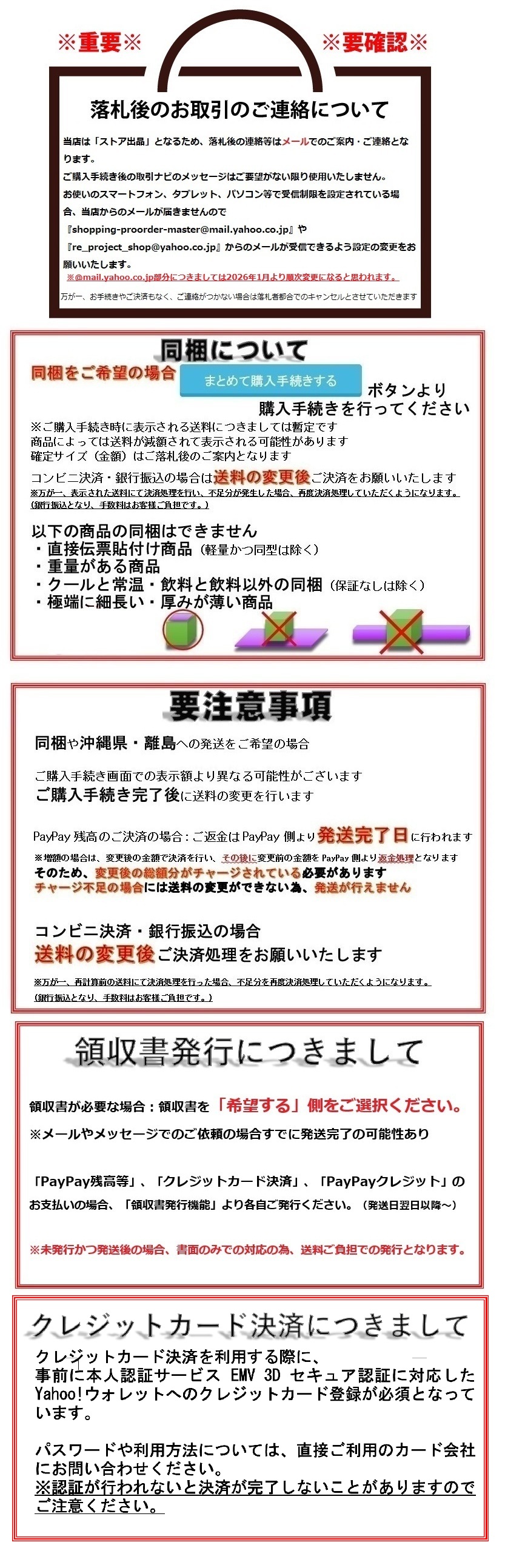 ※同梱可能商品に限ります。 定形郵便や定形外郵便(規格内)と定形外郵便(規格外)の同梱(定形外郵便発送)につきましては 佐川急便をご選択の上、ご要望欄に定形外郵便発送希望とご入力ください。 ご購入手続きが完了ののち、当方より手動で『お支払い総額のご案内』と『送料の変更』をいたします。 ご決済時の注意事項は下記をご高覧願います。 ◆沖縄県・離島への発送、同梱希望の場合のご決済について ■クレジットカード決済、PayPayクレジット 再度オーソリゼーションが行われます。 万が一、通らなかった場合は銀行振込となります。 ■銀行振込の場合 ご案内前の内容ではご決済しないようにお願いいたします。 万が一、不足金額にてご入金いただいた場合、不足分の追加入金の確認ができるまで商品の発送ができませんのでご了承ください。 超過分につきましては、銀行振込にて手数料を差し引いてのご返金となります。 ■コンビニ決済の場合 (※12月はご利用できません) 再度お支払番号を発行いたしますので、新たなお支払番号にてご決済ください。 ■PayPay残高等払いの場合 ご購入手続き時の表示金額より減額・増額により、お手続きが異なります。 減額となる場合: 発送完了日にPayPay側より返金処理となります。 増額となる場合: 変更後の金額で決済を行い、 その後に変更前の金額をPayPay側よりご返金処理となります。 ※増額となる際にチャージ不足の場合には、送料の変更ができない為、発送が行えません。 不足額のみのご決済はYahoo!オークションシステム上、銀行振込のみ対応可能です。 Yahoo!ショッピングヘルプ PayPay残高等払いについて(旧名称:PayPay残高払い・PayPay(残高)) https://support.yahoo-net.jp/PccShopping/s/article/H000011025#changeamount ◆普通郵便でのオプションについて