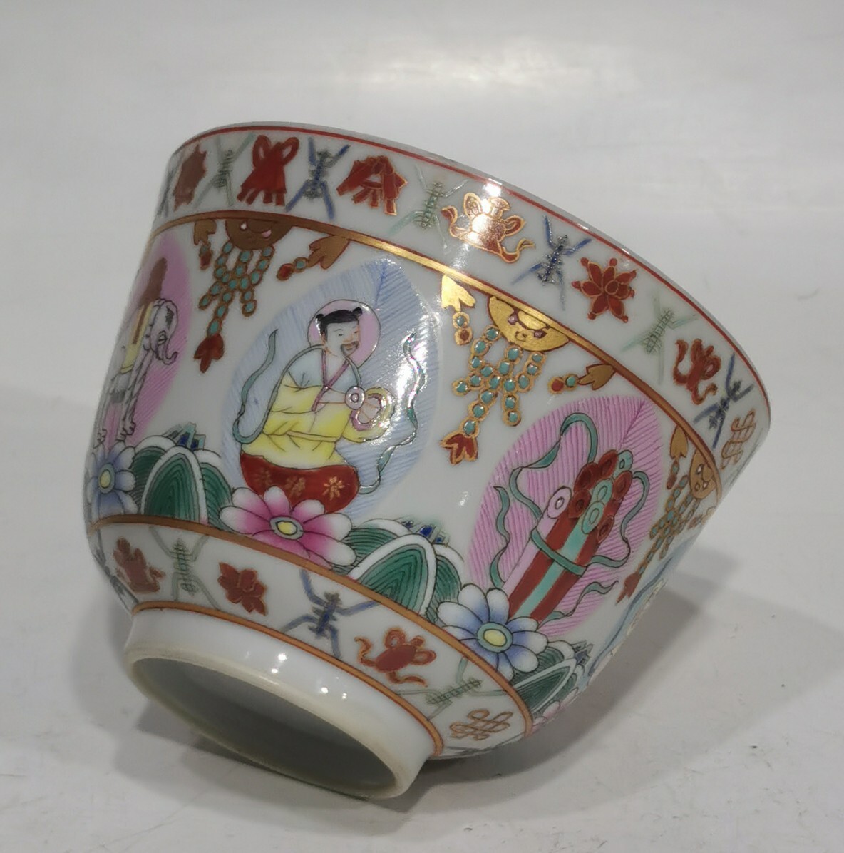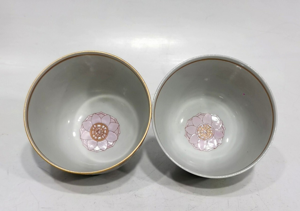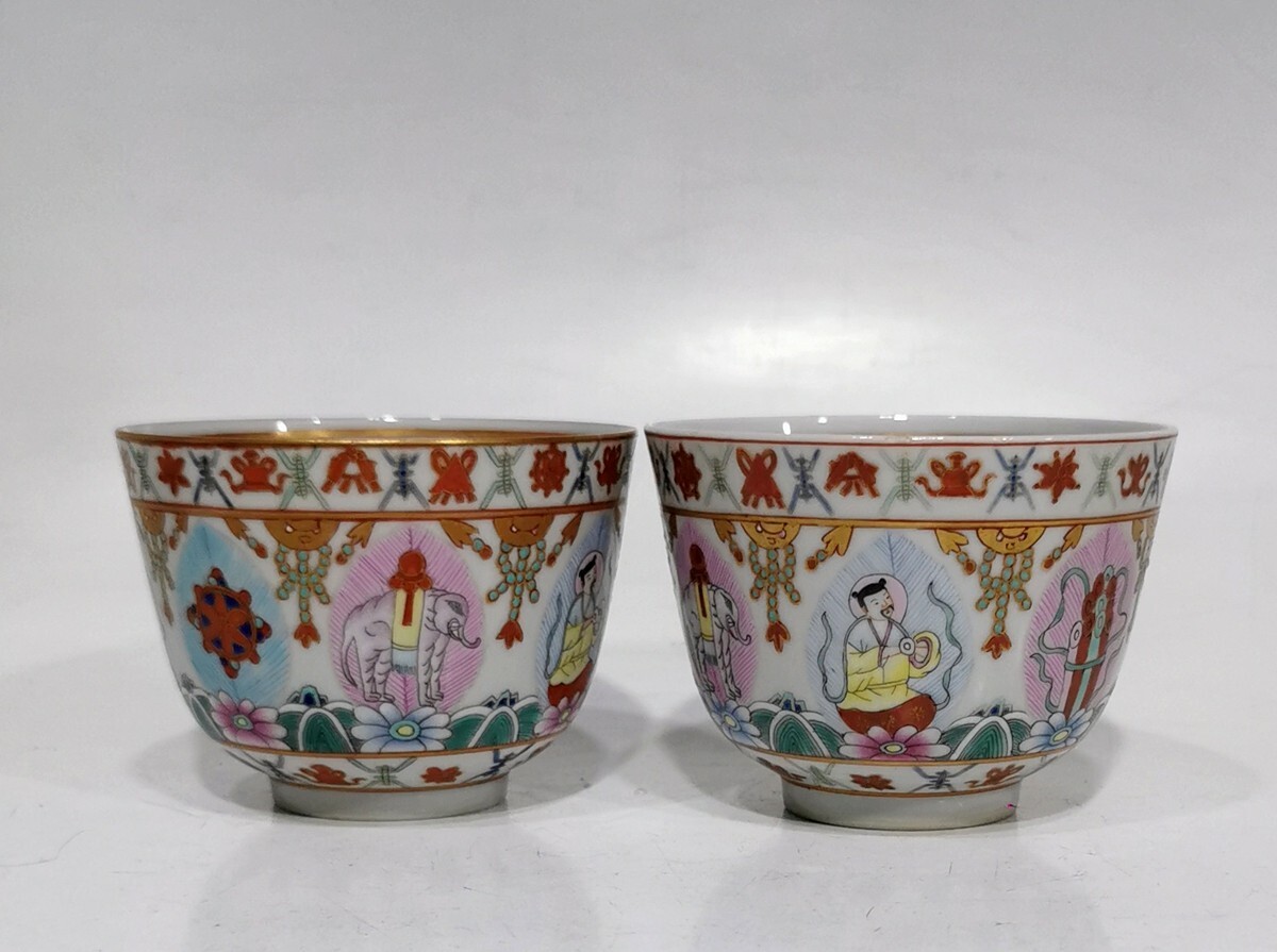「清 道光年製 陶磁器 粉彩七珍八寶 杯一対」染付 置物 擺件 古賞物 中国古美術 旧蔵出