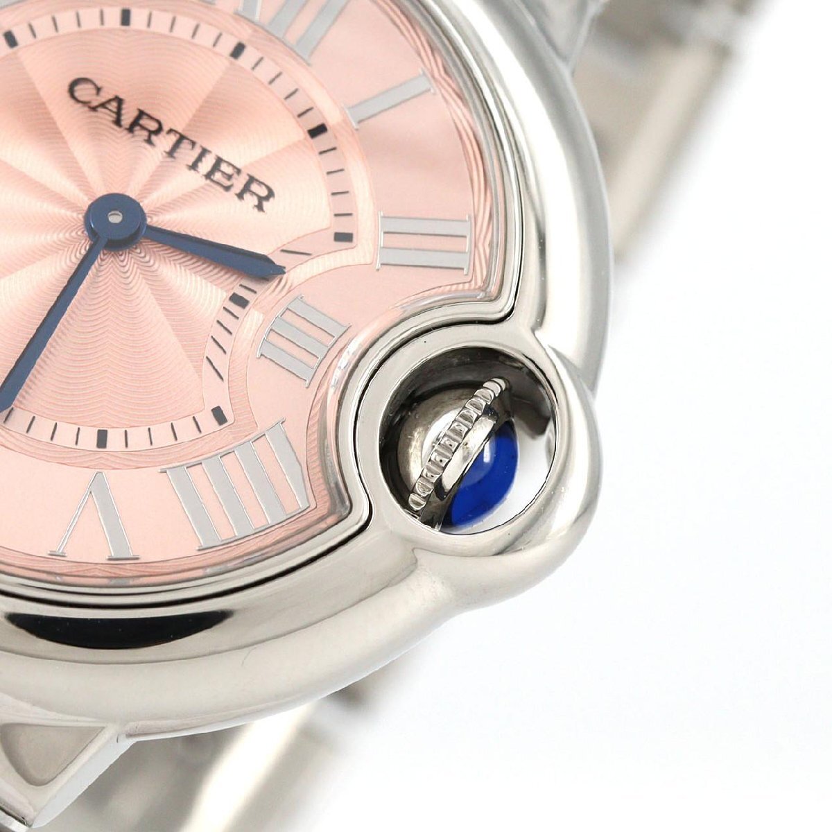 2007年の登場以来、カルティエの新たなアイコンとして絶大な人気を誇る「バロンブルー ドゥ カルティエ」。フランス語で“青い風船”を意味する名の通り、風船のように軽やかなフォルムと、青いカボションを閉じ込めたリューズガードが特徴です。当モデルは、柔らかなピンクダイヤルにギョーシェ彫りを施した、フェミニンで優雅な印象の一本。クラシックとモダンが融合したデザインは、あらゆるスタイルに気品を添えます。