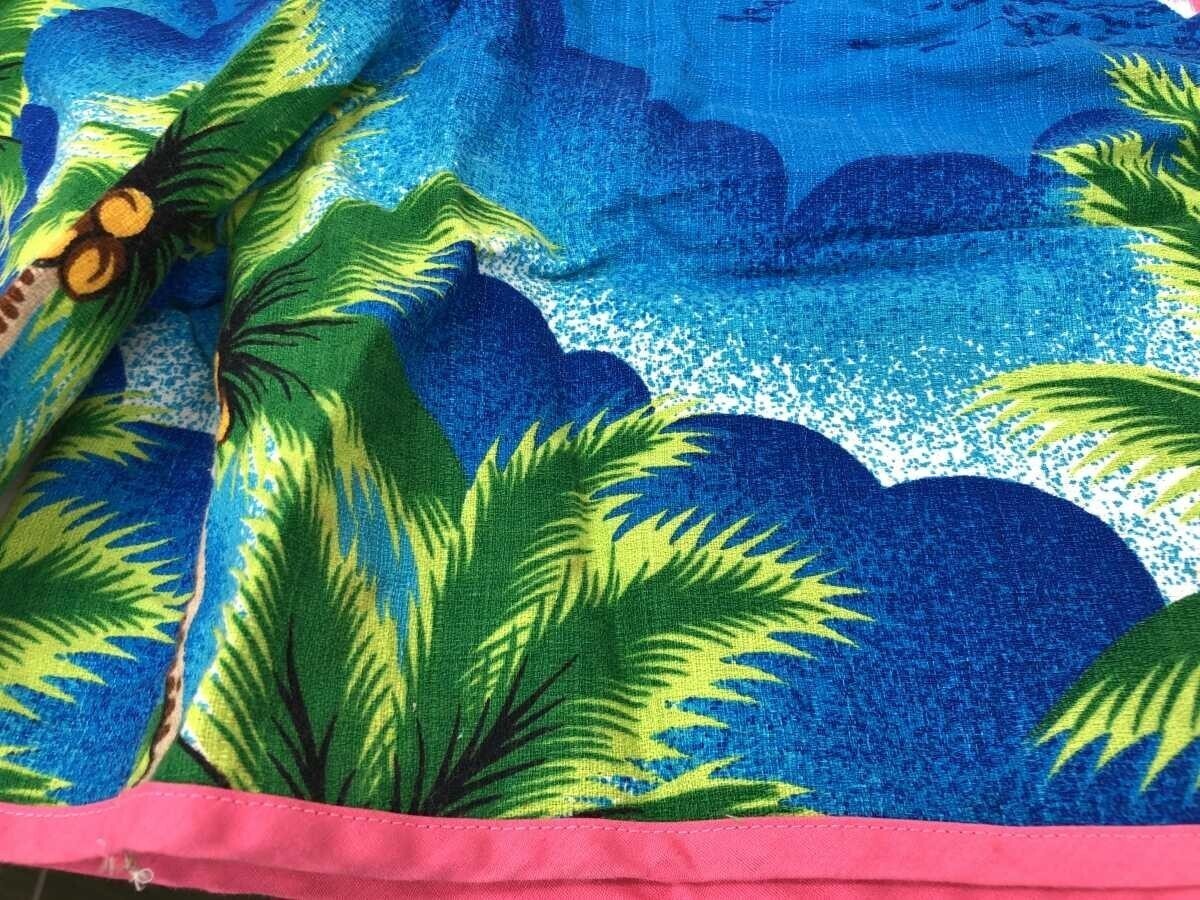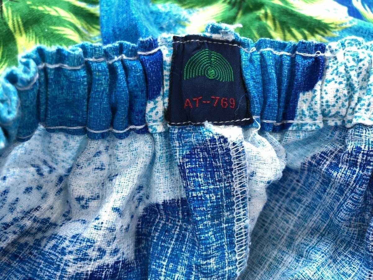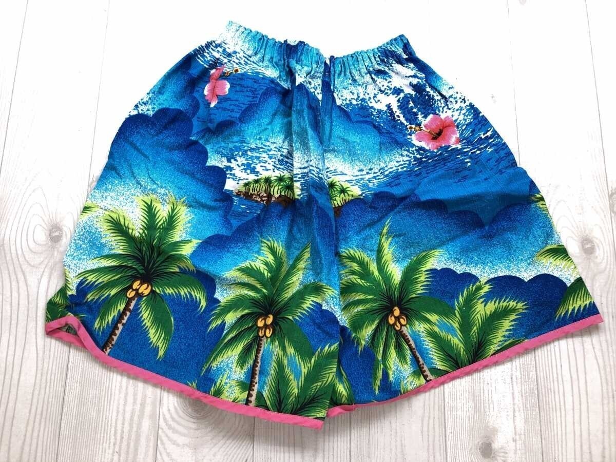 AT-769 レトロ オールド アメカジ サーフ ビーチ リゾート ハイビスカス ヤシの木 ハワイアン柄 ハーフ ショートパンツ ボトムス メンズ 青です。