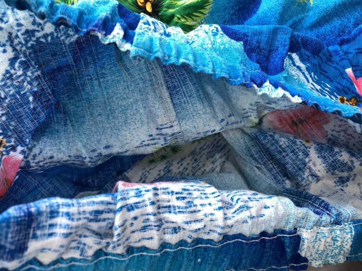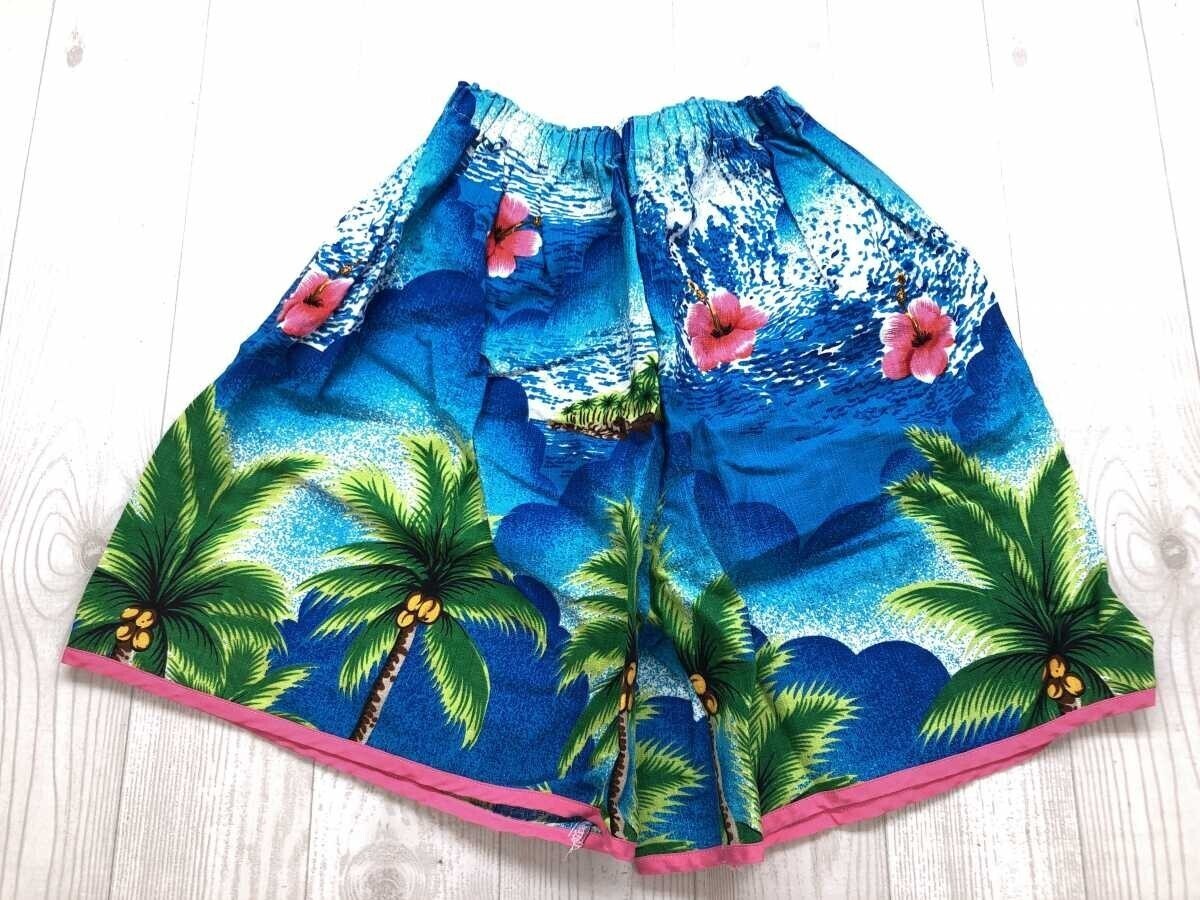 AT-769 レトロ オールド アメカジ サーフ ビーチ リゾート ハイビスカス ヤシの木 ハワイアン柄 ハーフ ショートパンツ ボトムス メンズ 青です。