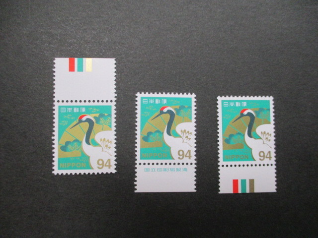 慶事切手  つる・94円  カラーマーク上・下・銘版単片各1枚*3枚   美品
