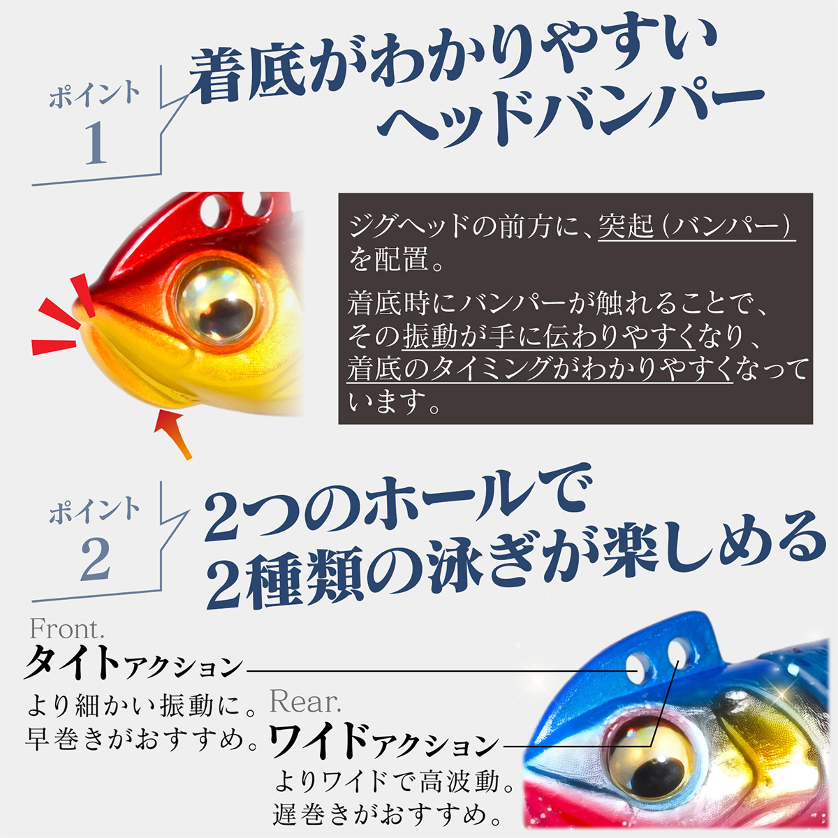 ジグヘッドはフックを外さなくてもワームが交換できるタイプで、ワームの交換が手軽にできます。