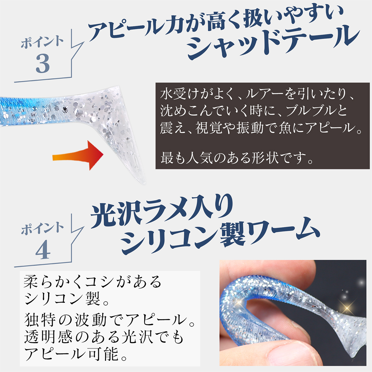 ワームはシャッドテールという水流を受けやすい尻尾で、ただ巻きでもブルブルと動き、初心者でも扱いやすい形状です。