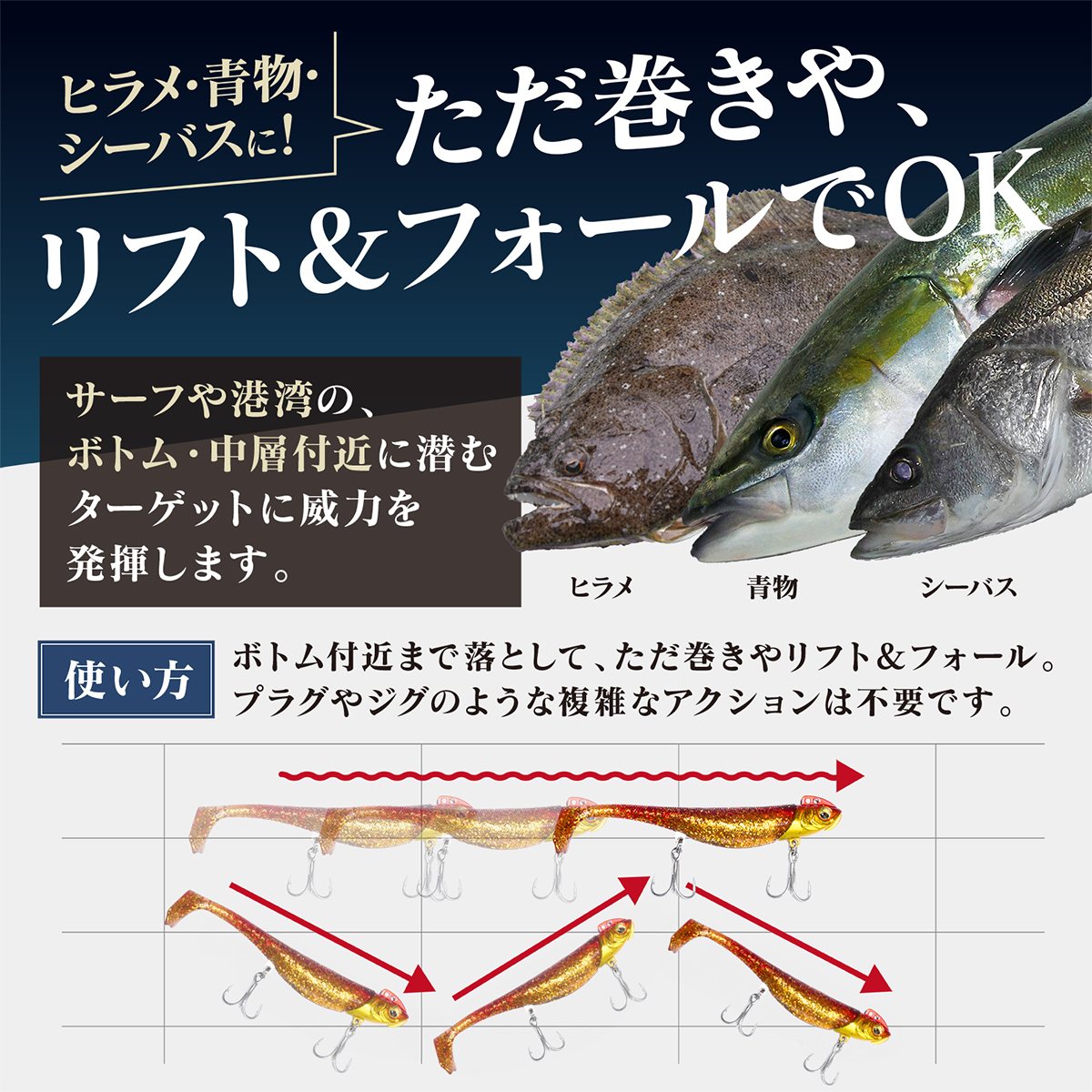 緩急つけたただ巻きやリフト&フォールで、ヒラメやマゴチなどのフラットフィッシュが狙える手軽さが人気の「ヒラメワーム3色セット」です。