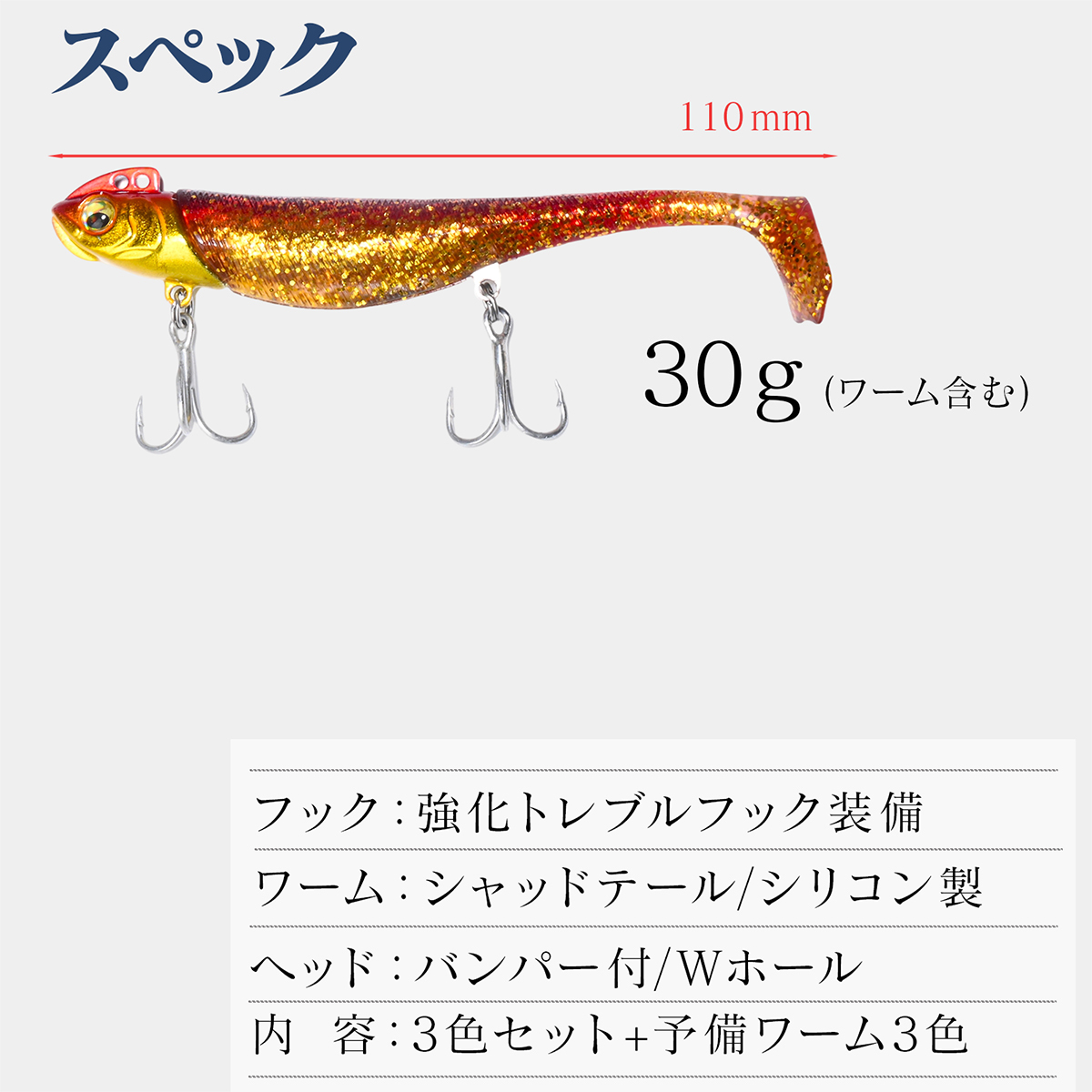 〇30g(ジグヘッド23g ワーム7g) / 約110mm(ワーム部分90mm 3.5インチ)