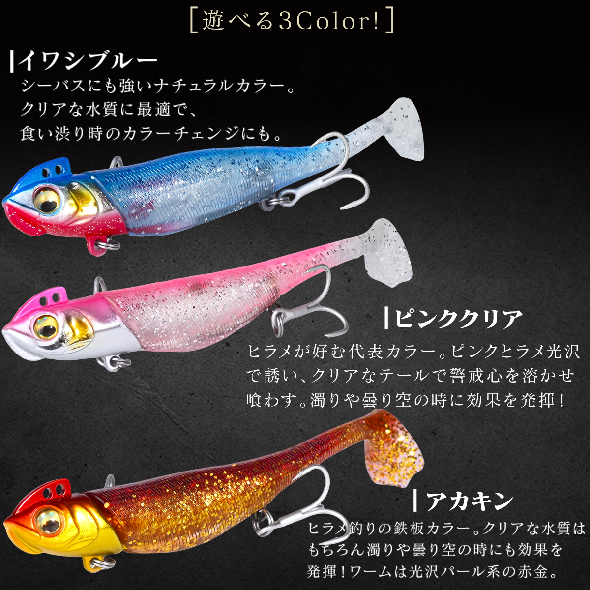 3色セットですので、水質や天候の変化に合わせたカラーローテーションが組めます。