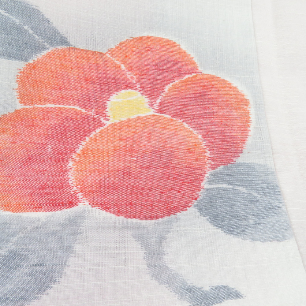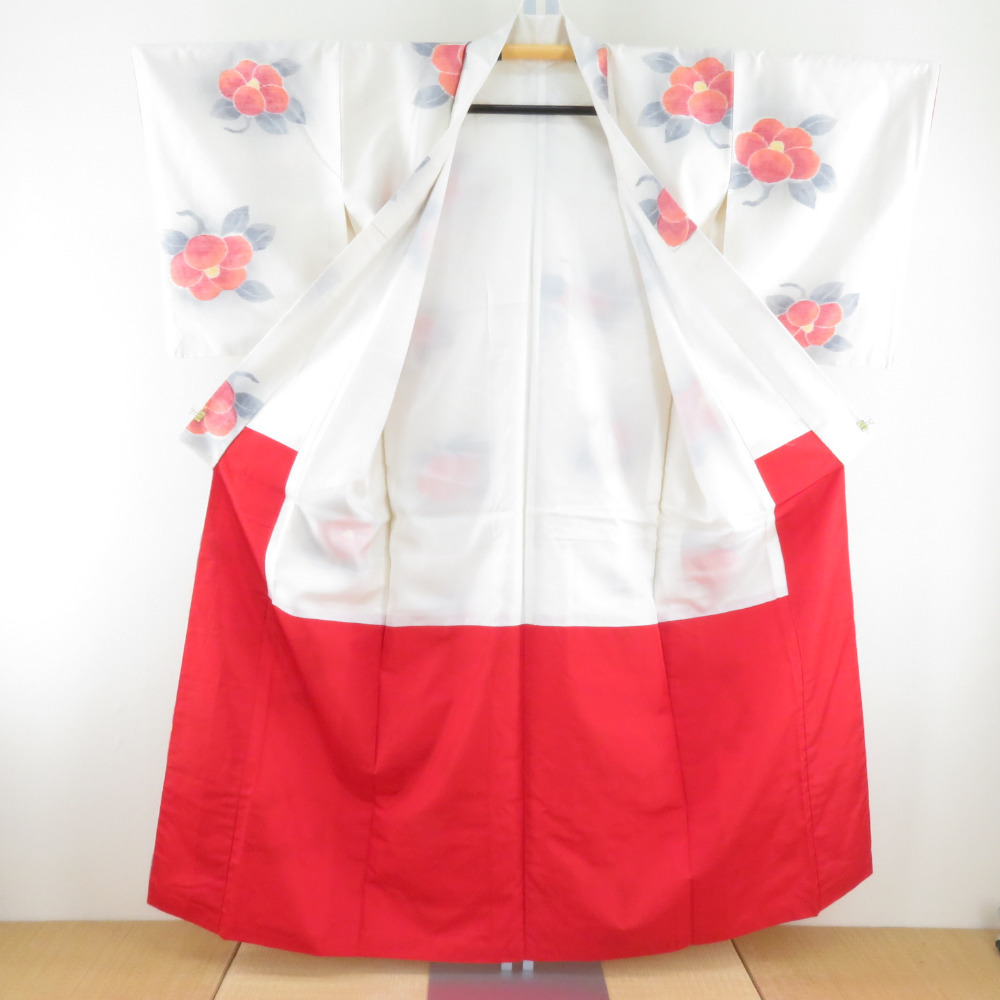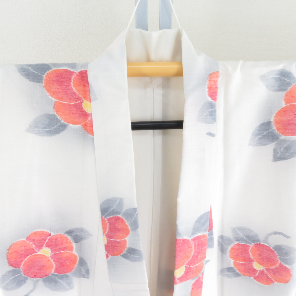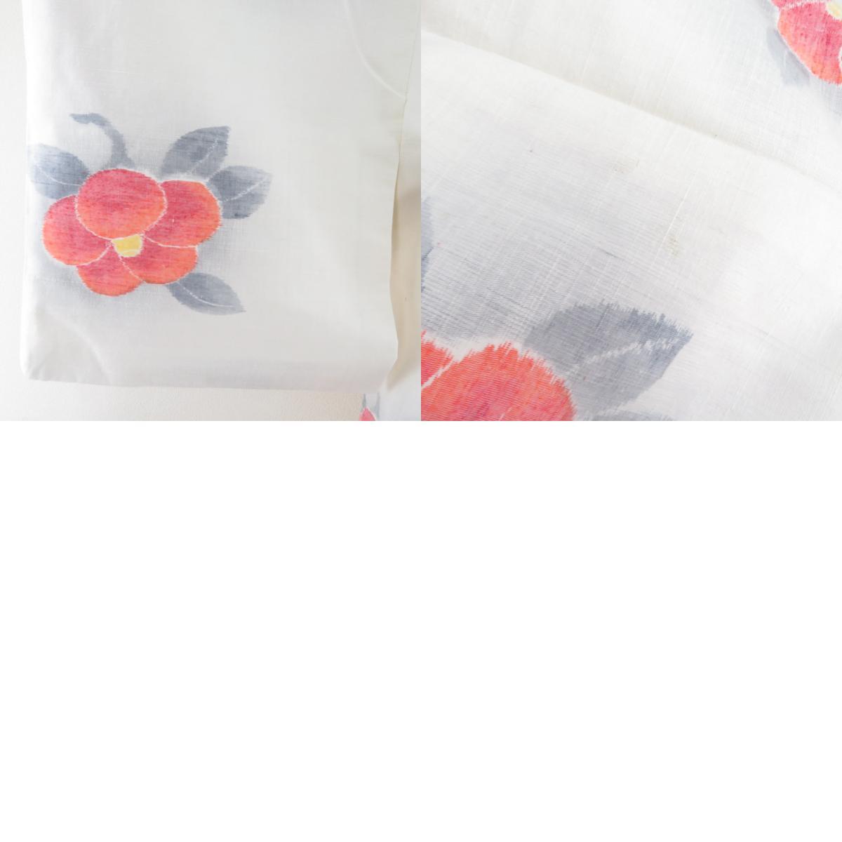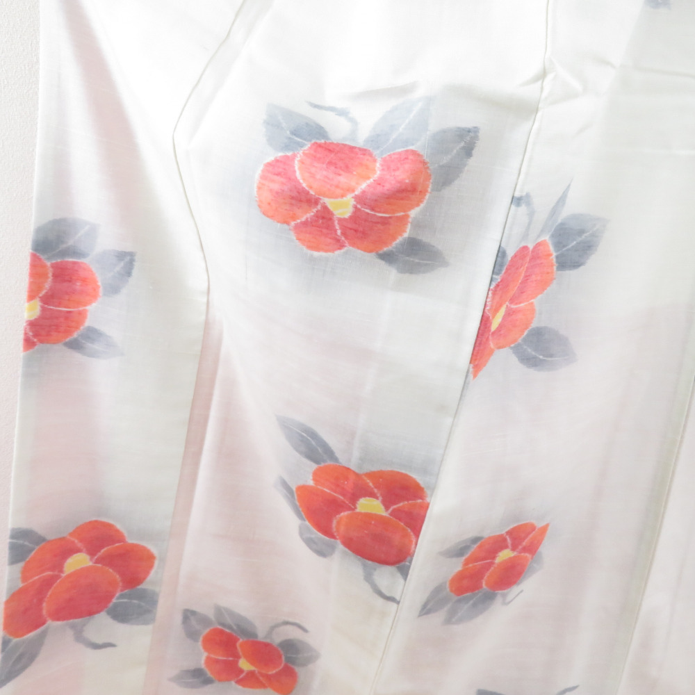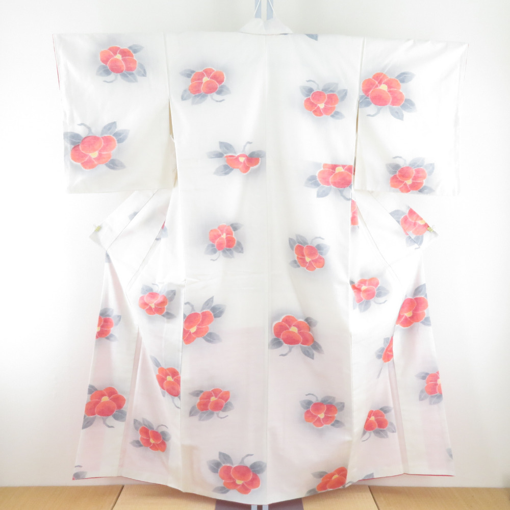 | 紬 着物 椿文様 袷 バチ衿 白色 正絹 カジュアル着物 仕立て上がり 身丈154cm |