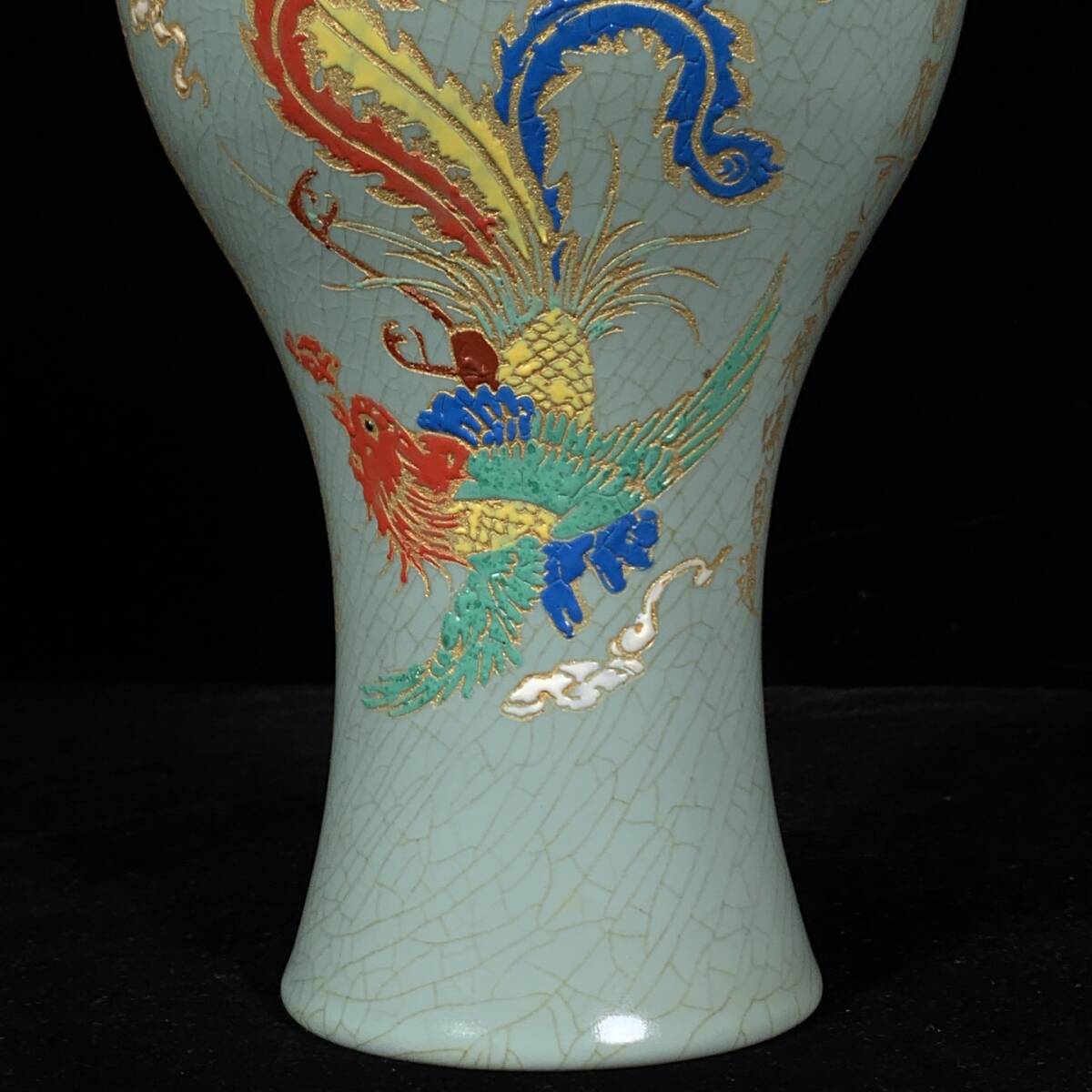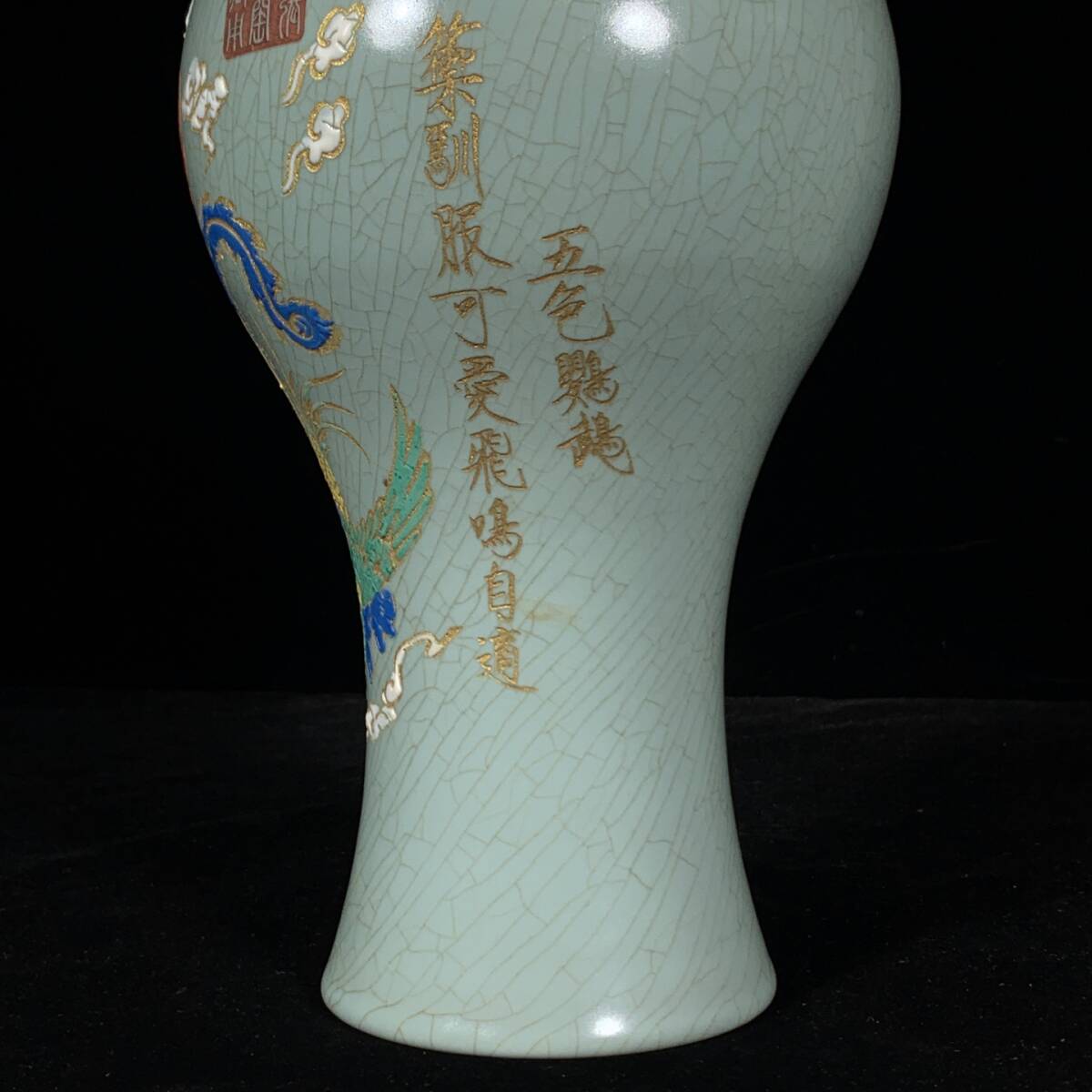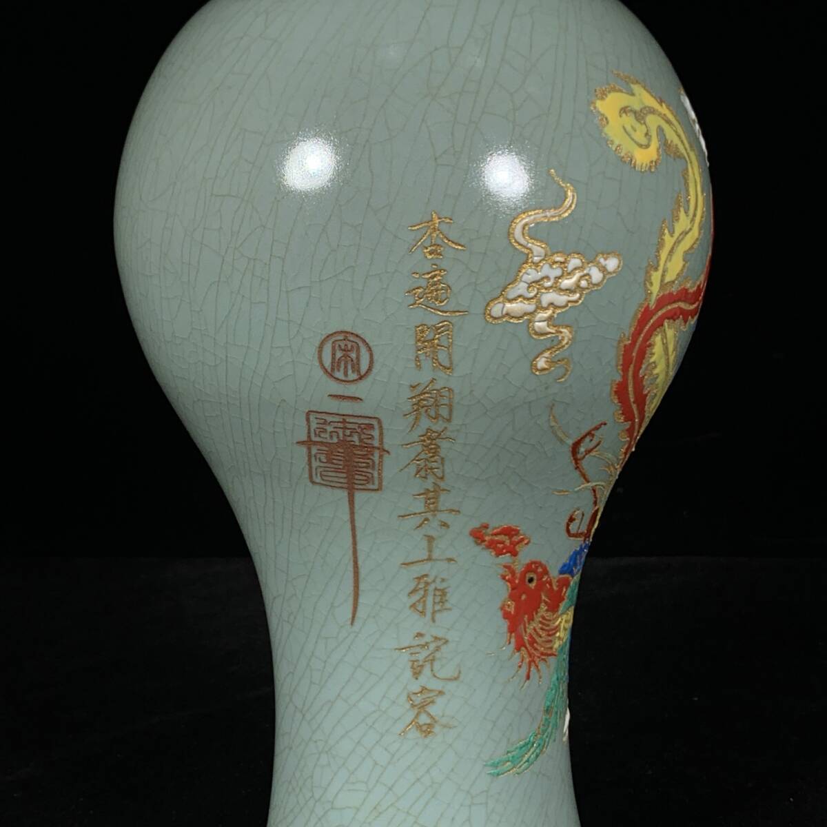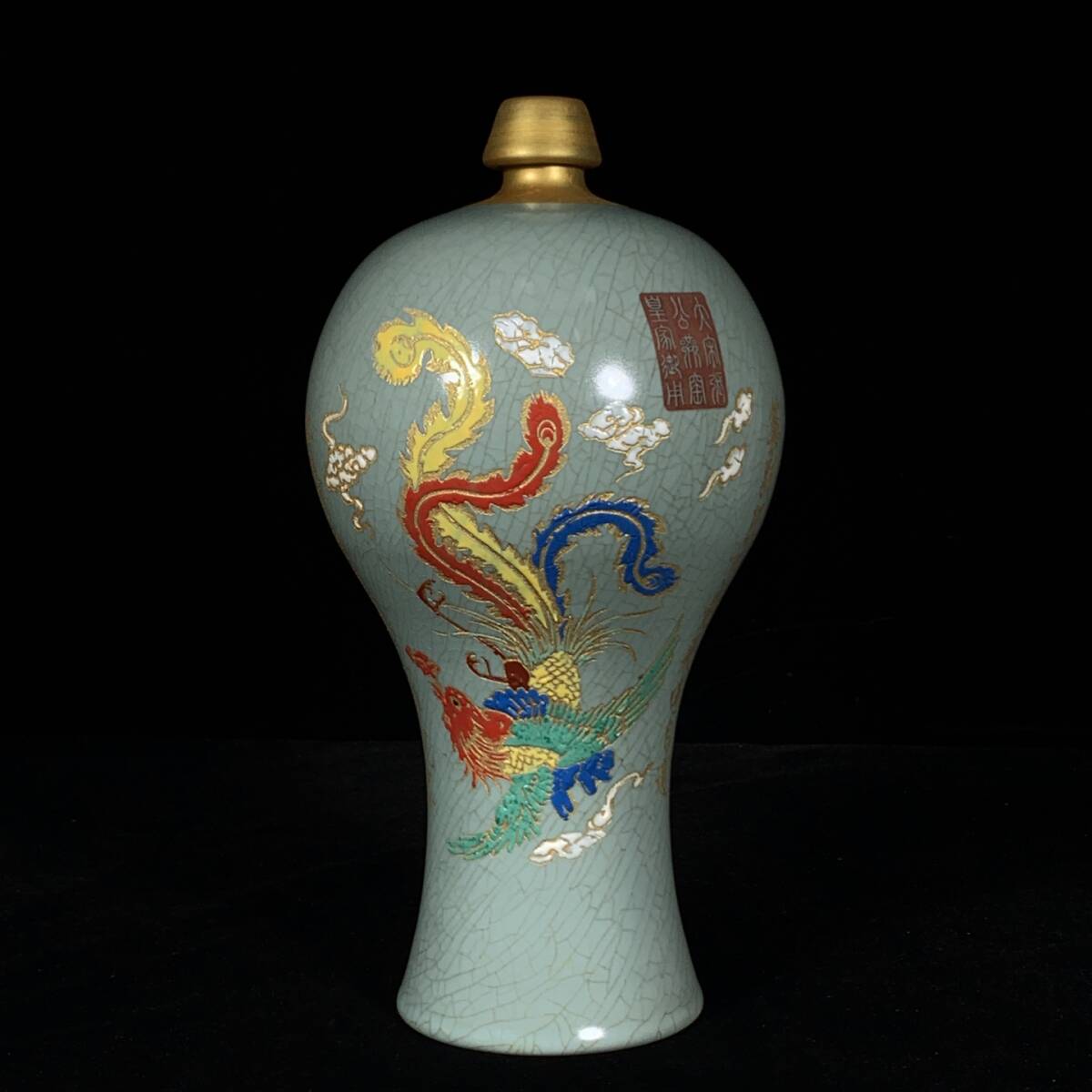 【超珍館蔵】宋 古陶瓷品 汝窯 彩繪 銘文 鳳紋 梅瓶 陶藝 古賞物 古董品 古美術品 時代物 旧家蔵出 稀少珍蔵品