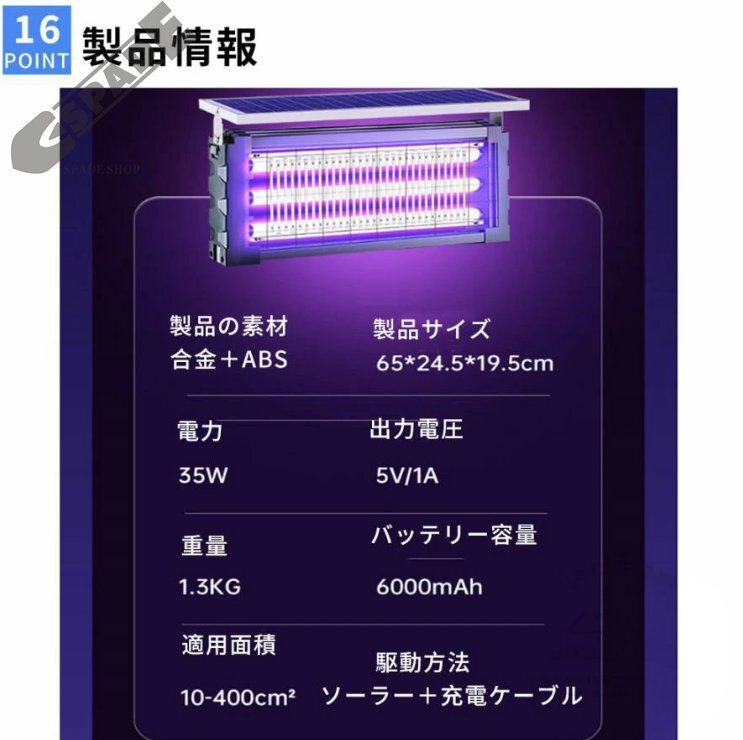 | 商品仕様 | 約65*24.5*19.5cm 重量:約1.3kg 出力電圧:5V/2A 適用面積:10-400平方メートル 有効範囲: スタンダード版:10~200平方メートル (20w) プレミアム版:10~300平方メートル (30w) アップグレード 版:10~400平方メートル (35w) 充電方法:ソーラー充電式/USB充電式 注意:充電入力には5 V 2 Aの充電ヘッドを使用する 用途:照明、害虫退治。 |