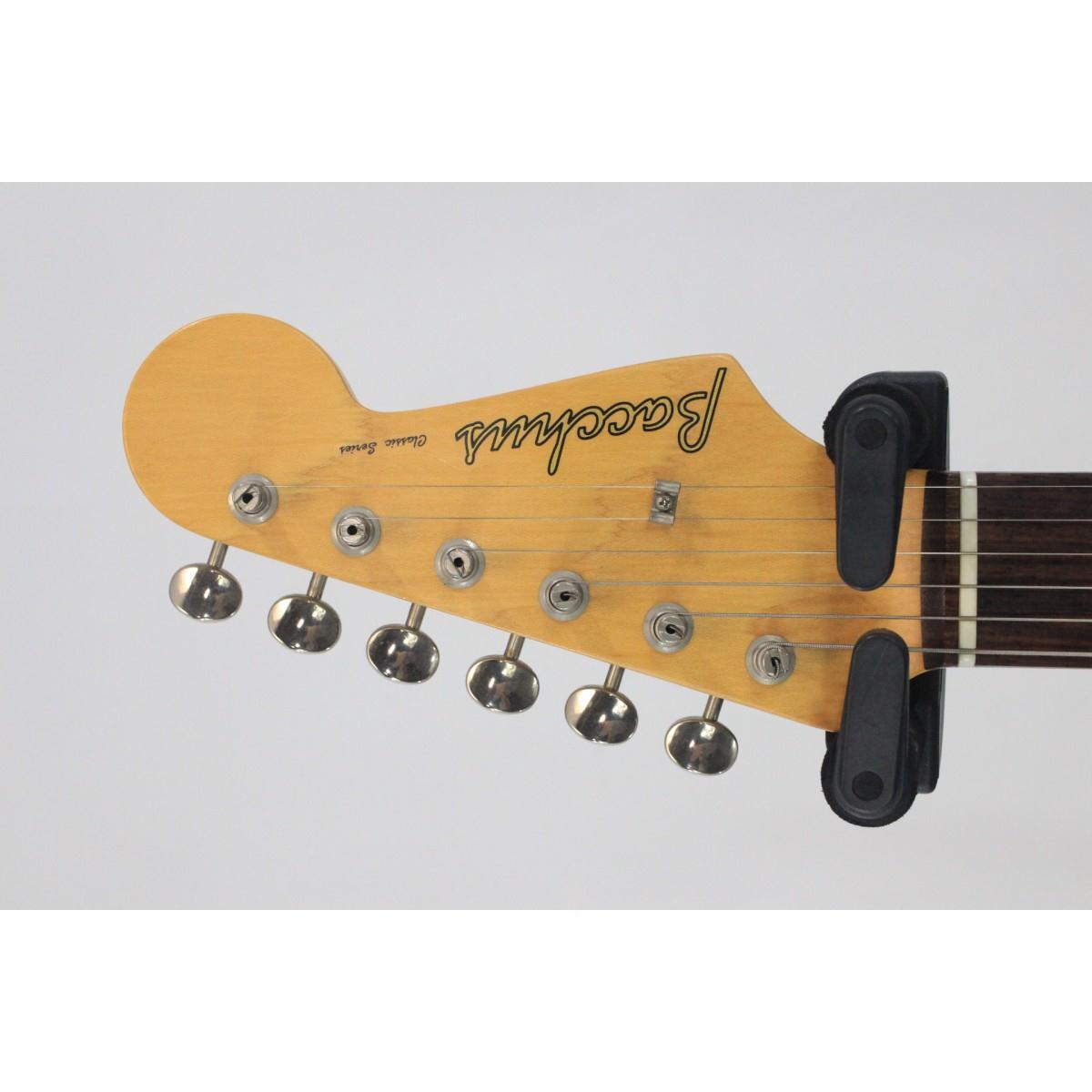 ヴィンテージシリーズのコンセプトを受け継ぐBacchusの国産ライン、『クラシックシリーズ』の60sストラトが入荷しました!ピックガードのビニールもきれいに残った良コンディションの個体です!60sをイメージしたアルダーボディにメイプルネック&ローズ指板仕様に、フィニッシュは経年変化による味わいが楽しめるトップラッカー塗装を採用。クロスワイヤーのBacchus SV-A5ピックアップを採用し、ナチュラルなボディの鳴りを活かした素直なサウンドをアウトプット。その他パーツ類もこだわられており、CTSポット、スイッチクラフトパーツにGOTOH製ペグ、と各所にこだわりが見受けられます。ガラスのように澄んだクリーントーンから、ブルージーなドライブまでしっかりカバーしてくれます。初めてのストラトをお探しの方はもちろん、セカンドギターとしてもおすすめの一本です!