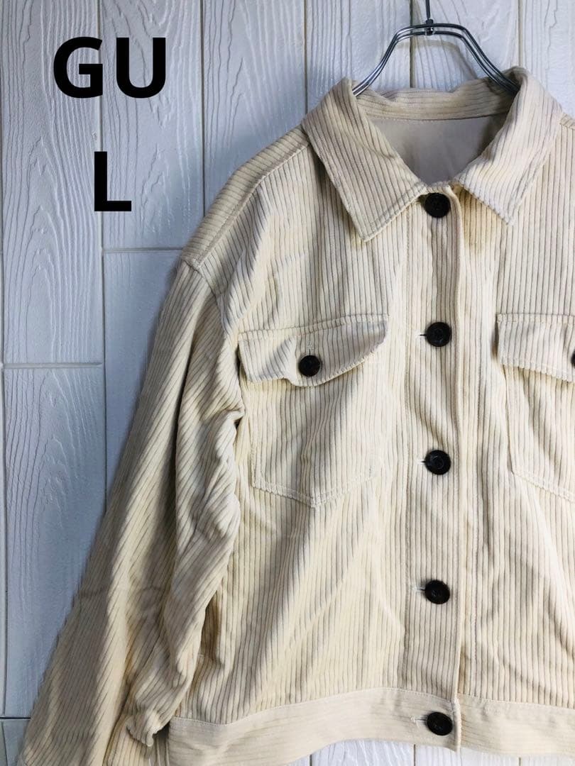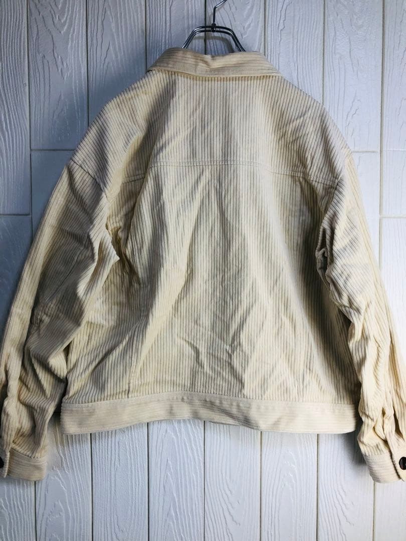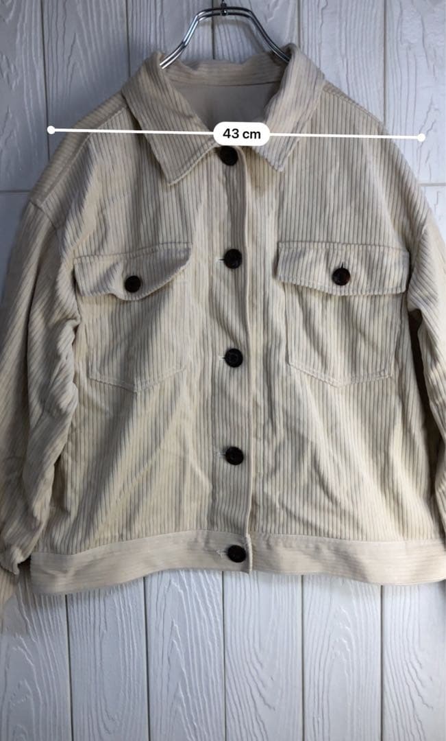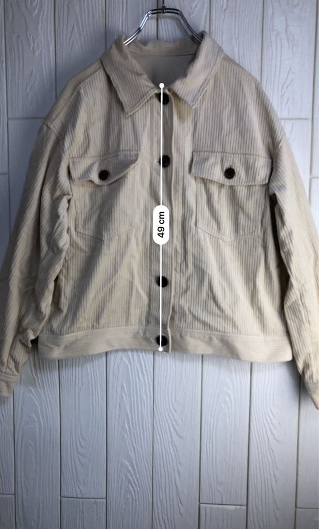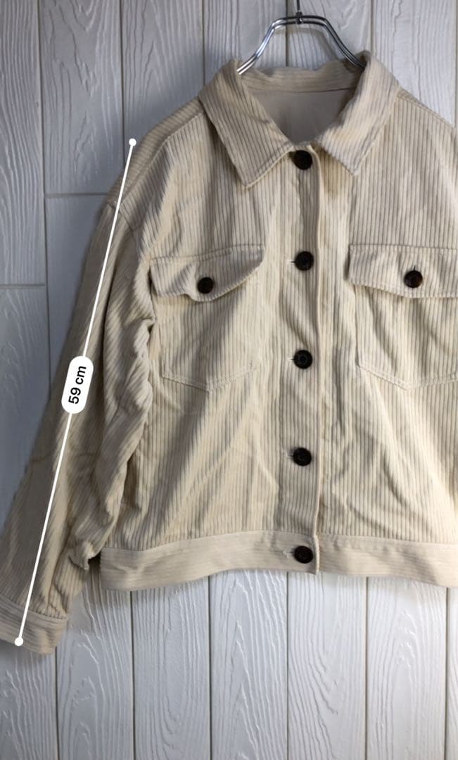コーデュロイ素材のベージュジャケット、カジュアルなスタイルに最適です。