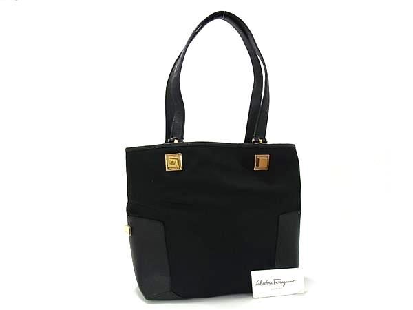 1円 Salvatore Ferragamo フェラガモ ナイロン×レザー ハンドバッグ トートバッグ 肩掛け レディース ブラック系 FS5579