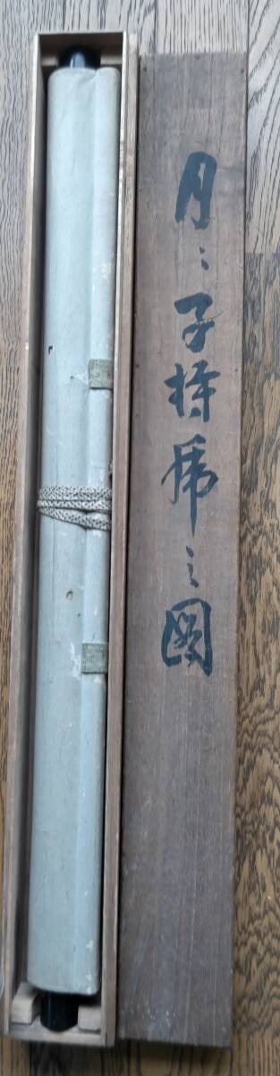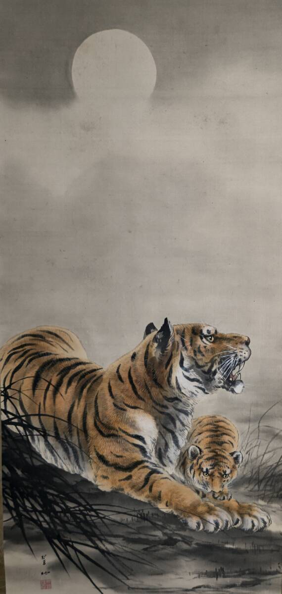 B8★【掛軸】【模写・大橋翆石】『月二子持虎之圖』絹本 共箱★