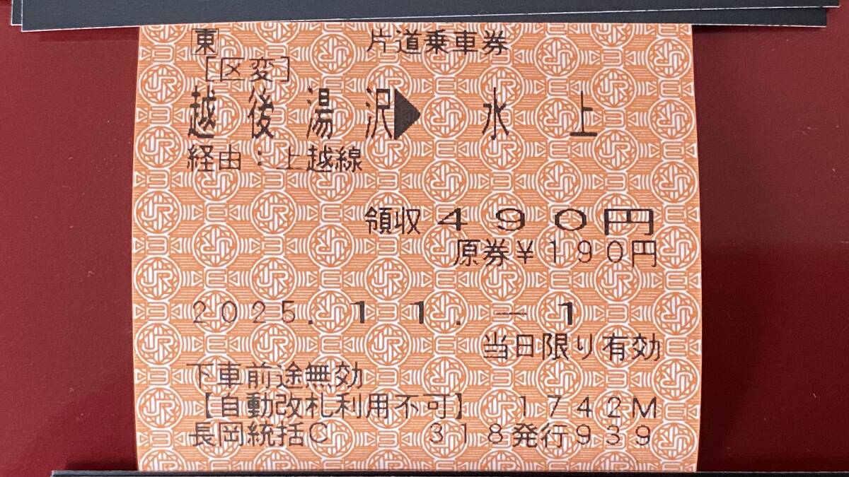JR東日本長岡総括センター発行の【区変】越後湯沢→水上 片道乗車券です。