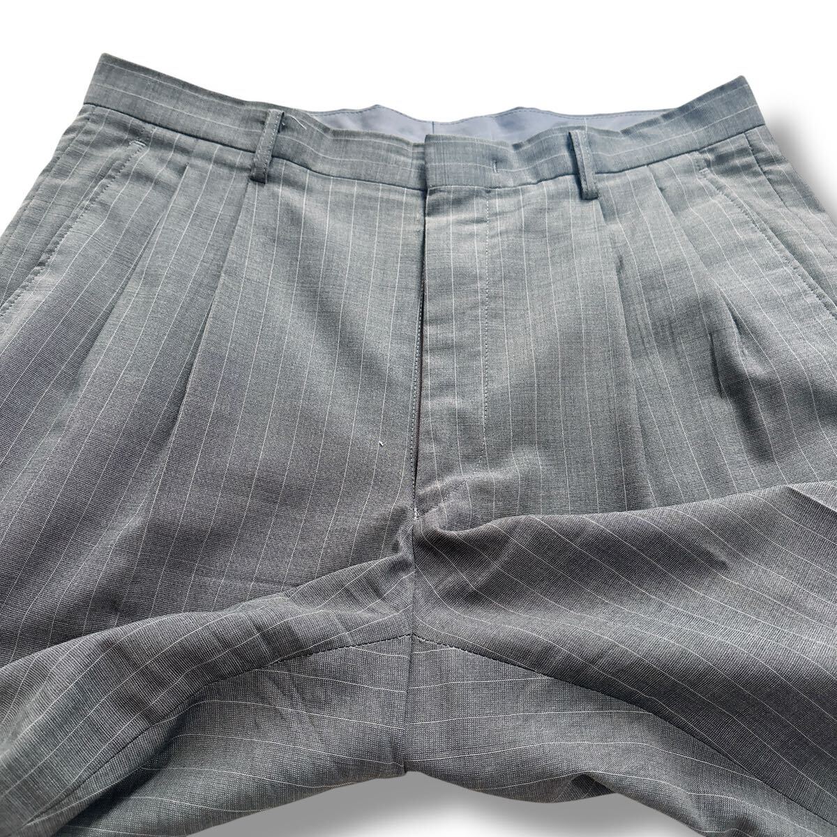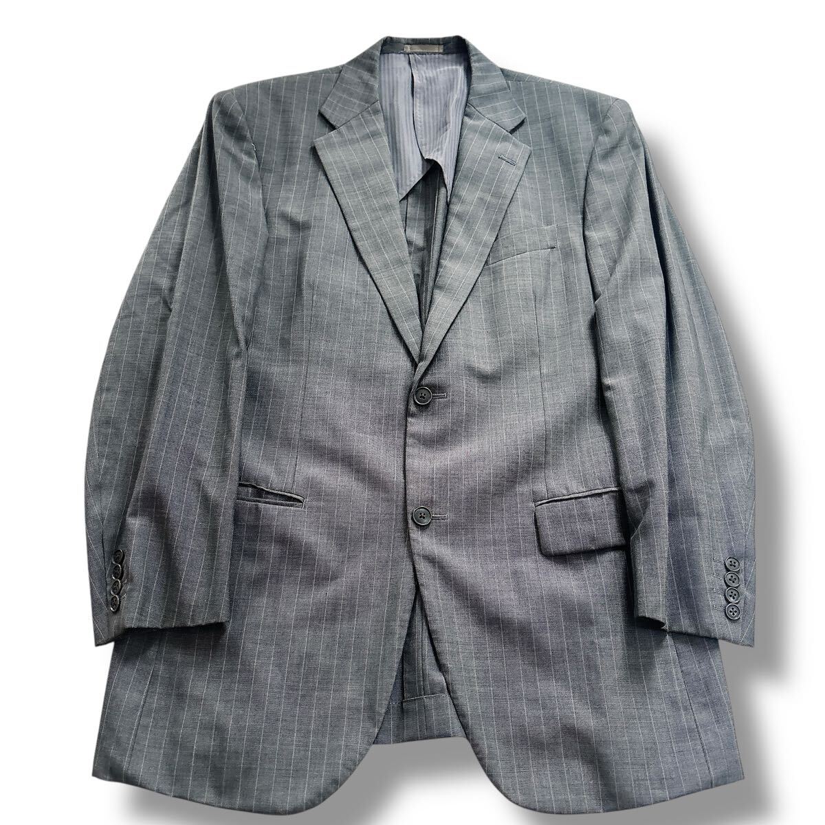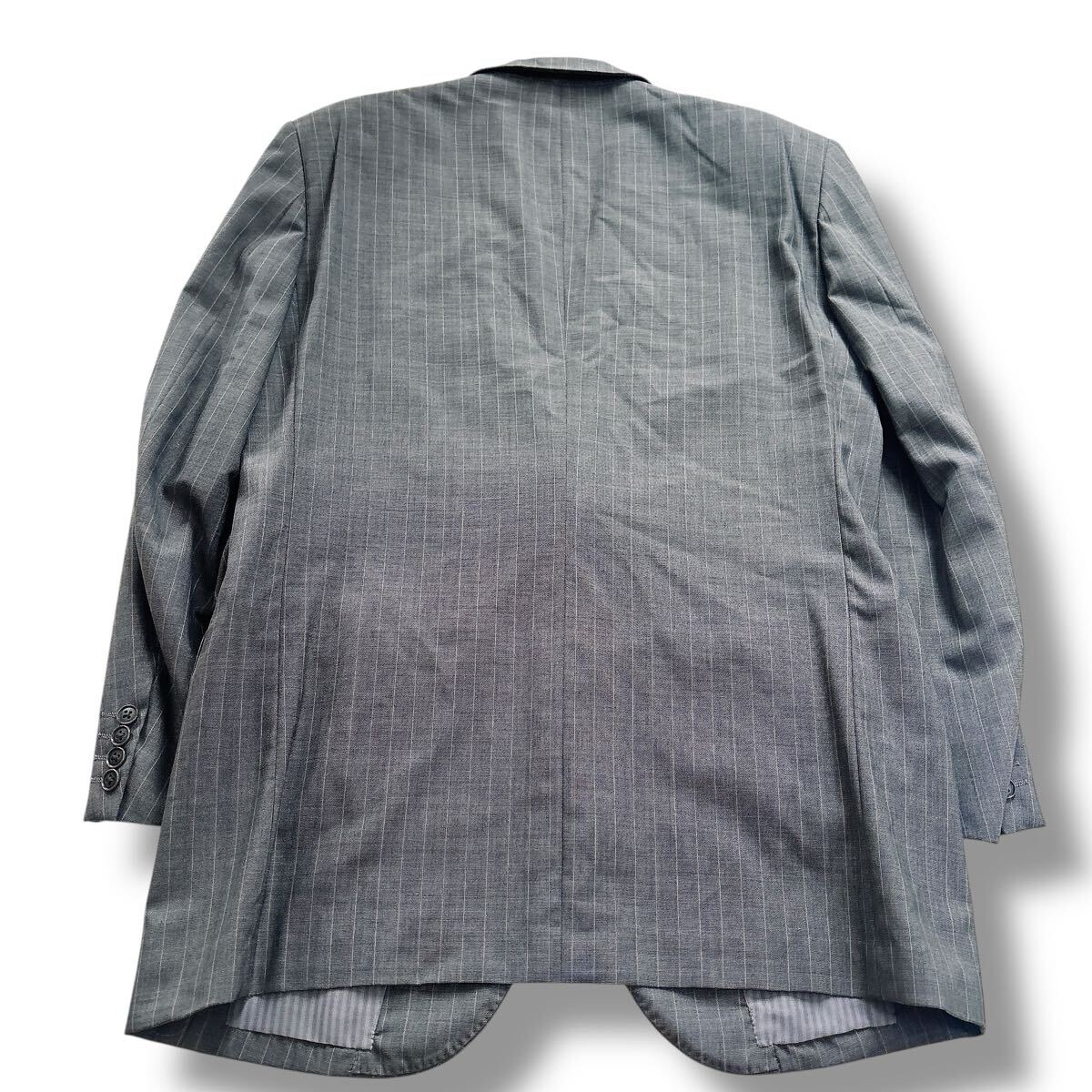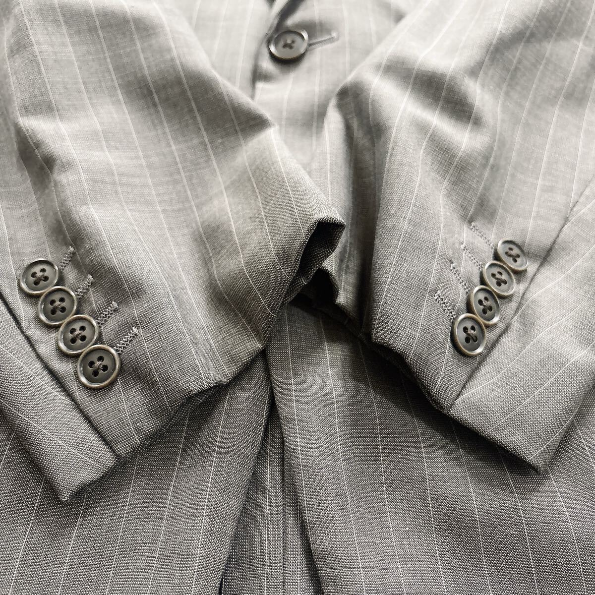 落ち着いたグレーのピンストライプ柄で、ビジネスやフォーマルな場にふさわしい一着です。
