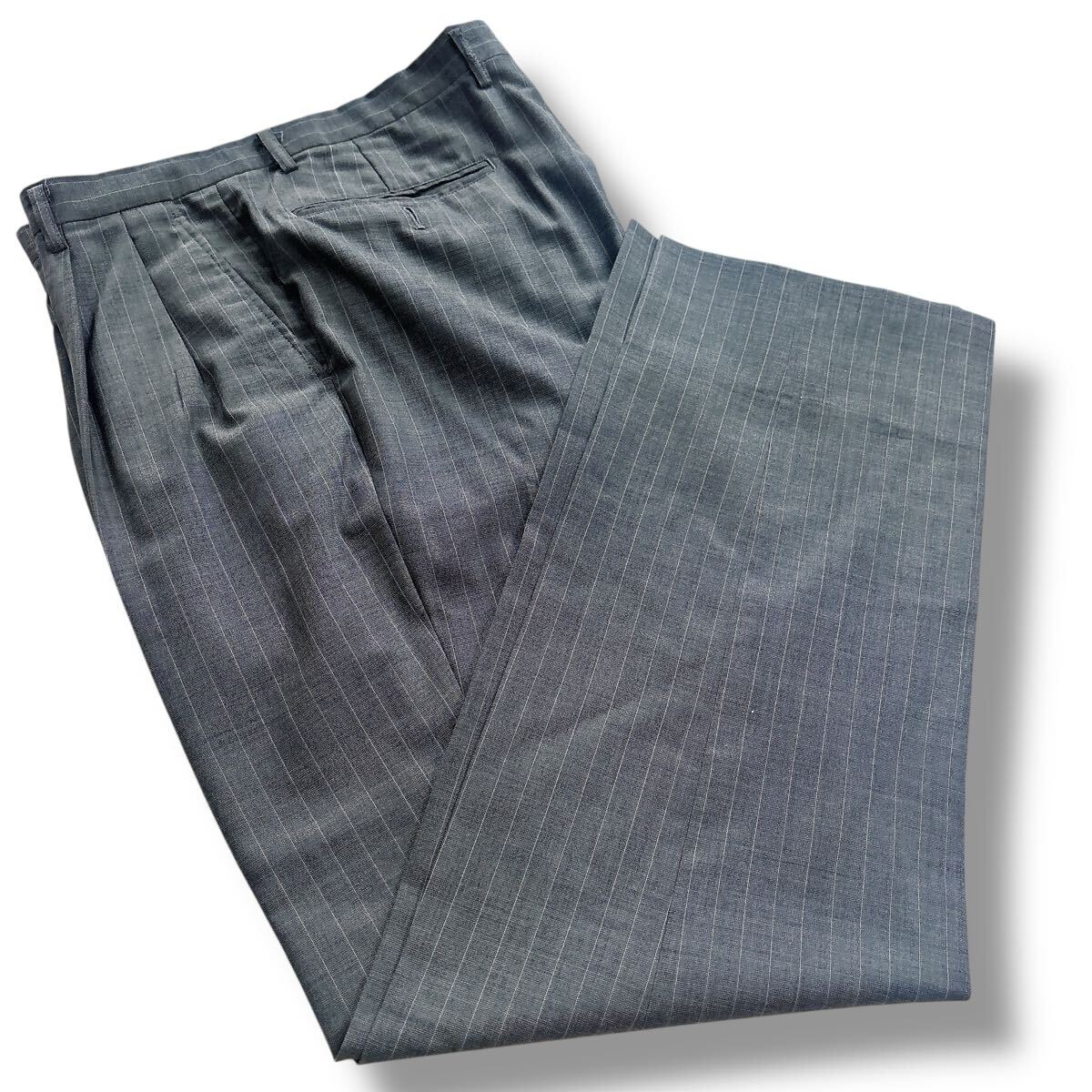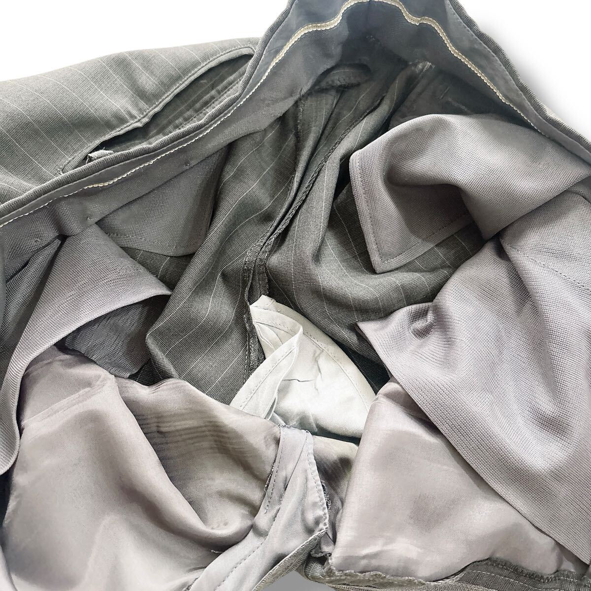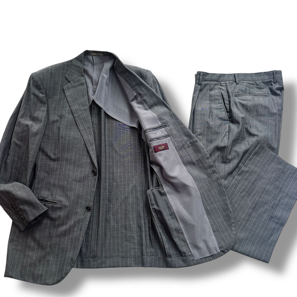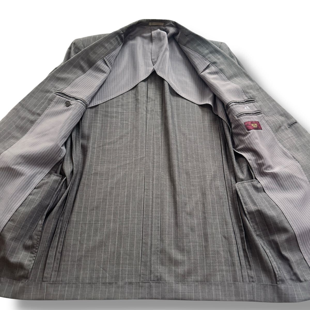落ち着いたグレーのピンストライプ柄で、ビジネスやフォーマルな場にふさわしい一着です。