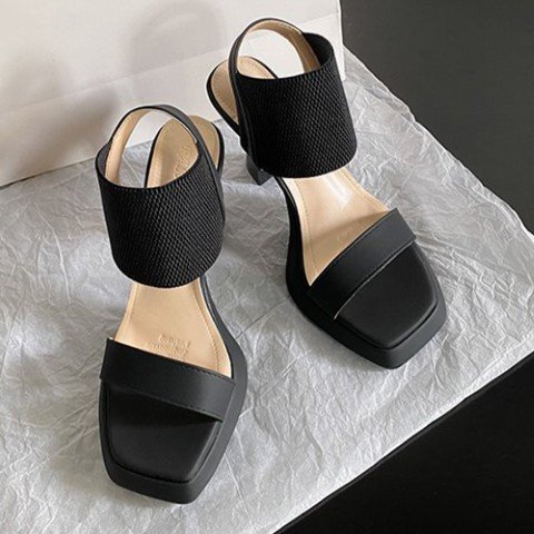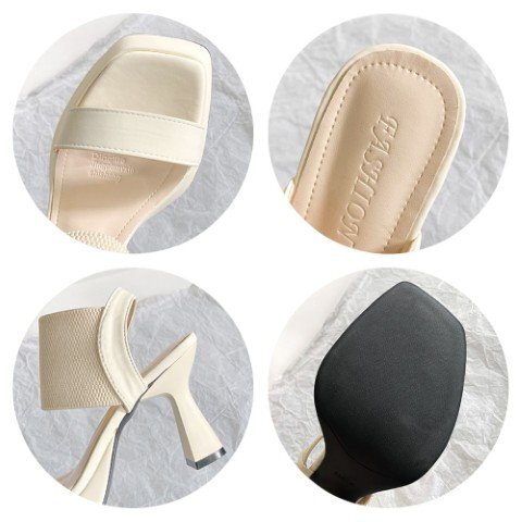 ブラック、アイボリー、キャメル3色展開のヒールサンダル。