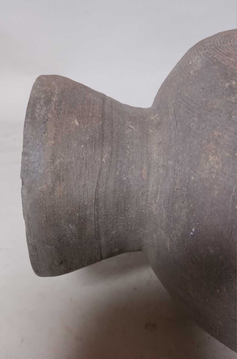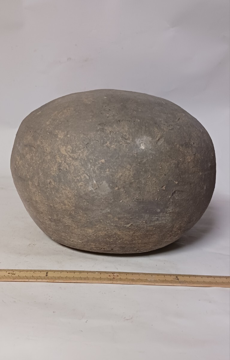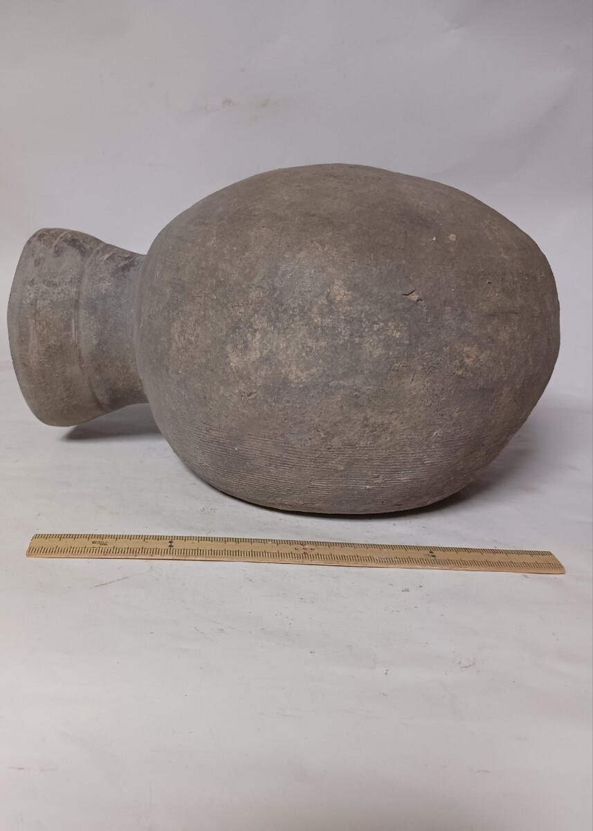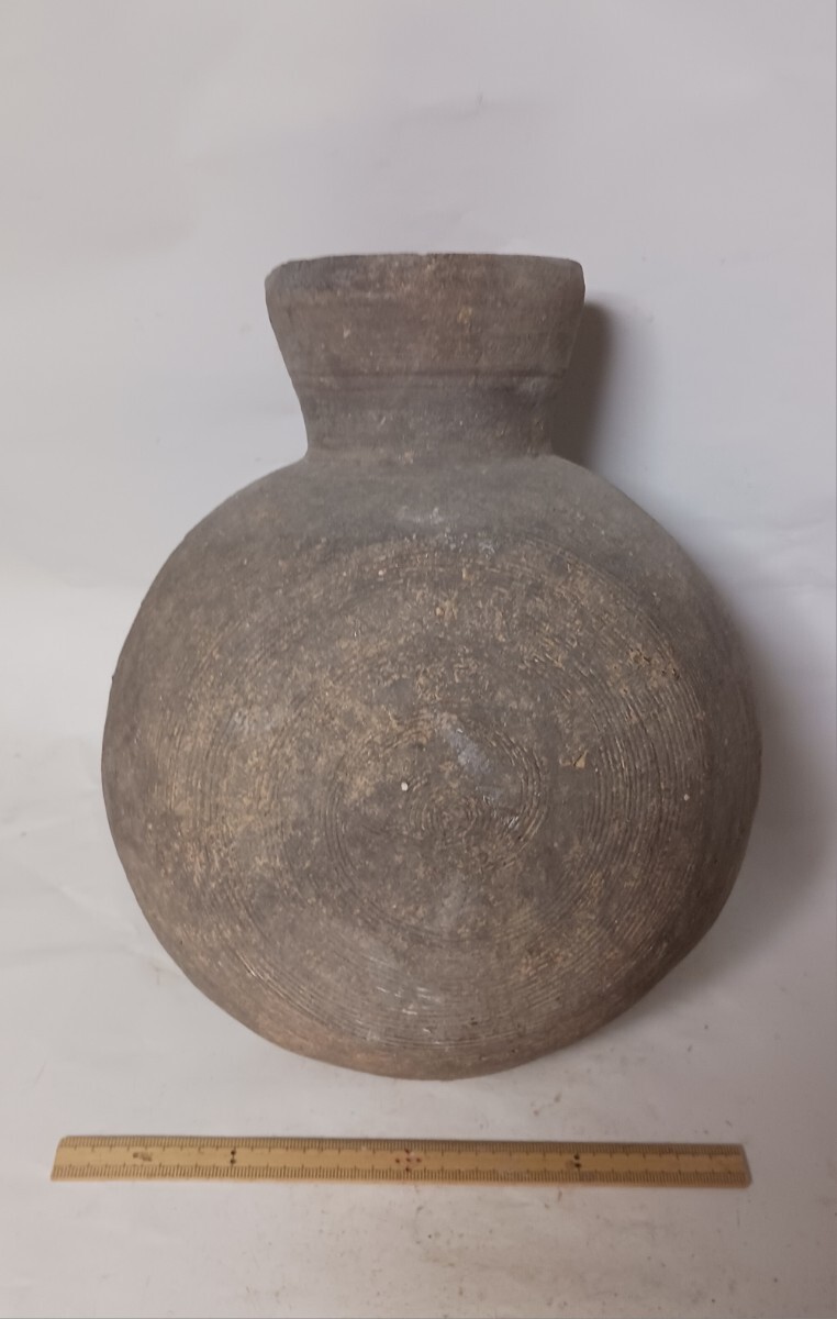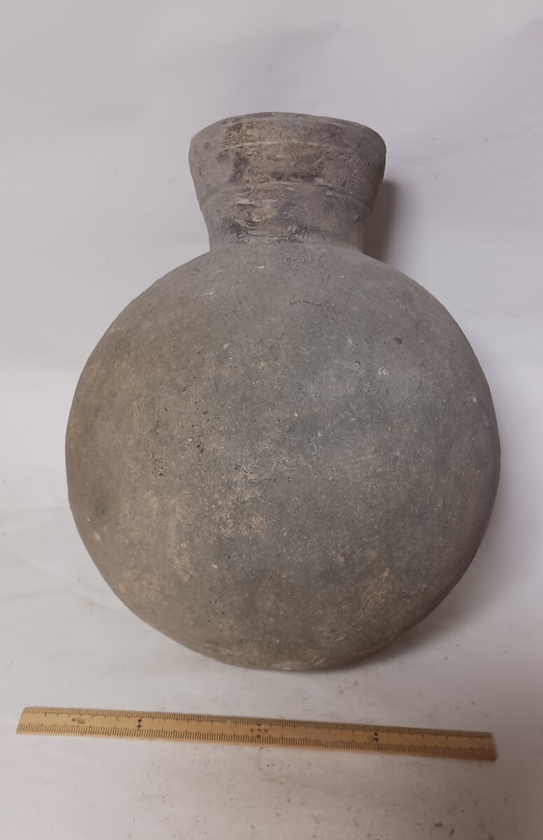 この提瓶は、胴部は傷はあるもののほぼ完全ですが、口縁には欠損があったようです。しかし、それらもうまく補修されています。95%以上がオリジナル部品です。時代的には古墳時代後期の7世紀頃のものと思われます。出土地は関西地方ですが、具体的な出土場所は不明です。大きさや状態は、写真参照して確認ください。