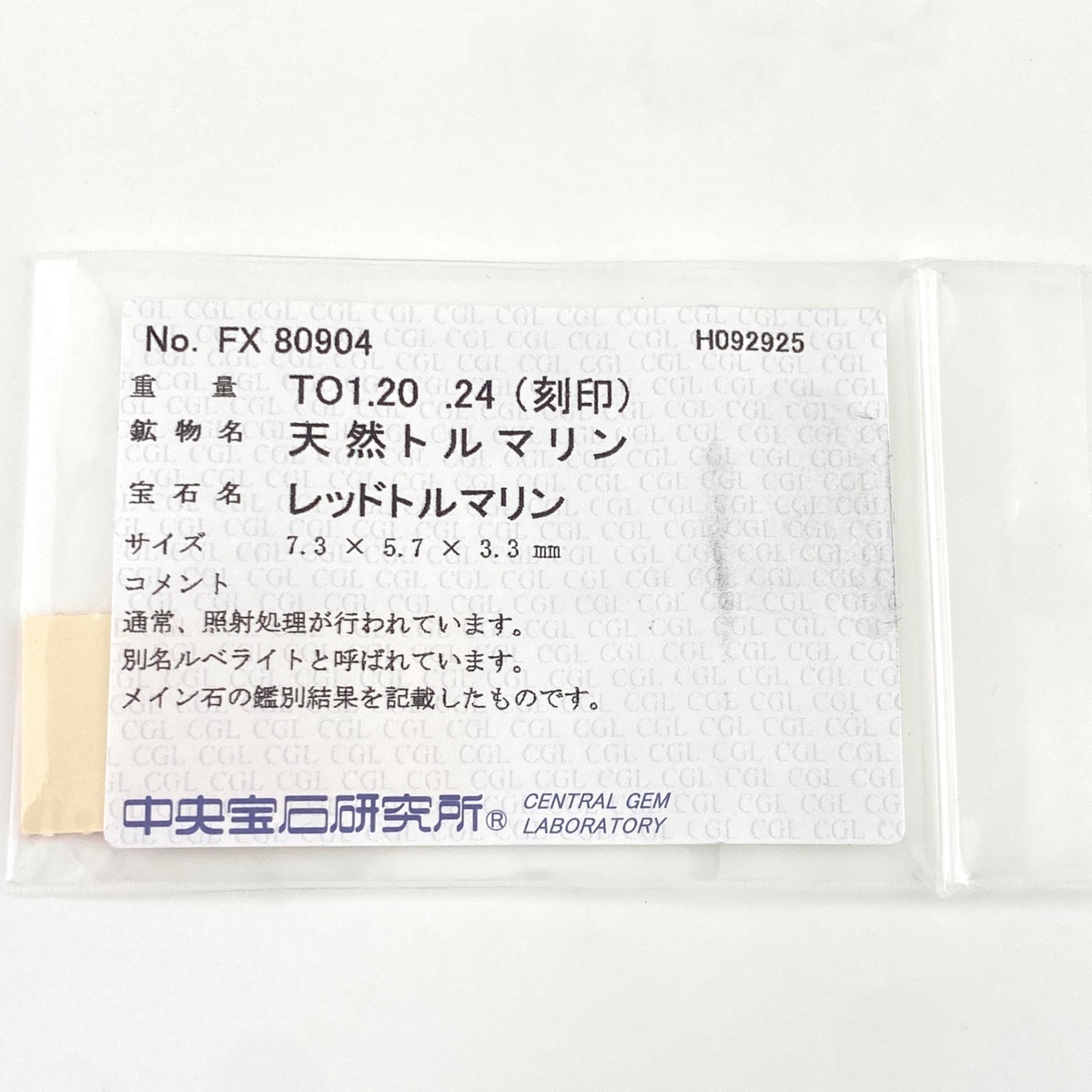 | レッドトルマリン:1.20ct、メレダイヤ:0.24ct 中古品の為、若干のキズや汚れ、レッドトルマリンにキズがございます。 |