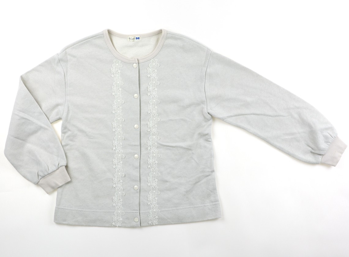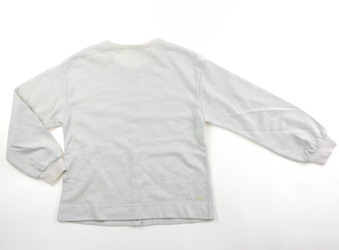 ライトグレーとアイボリーの中間色です。綿とポリエステルの薄手トレーナーです。左袖に黄色シミあり。所々にやや毛羽立ちあり。