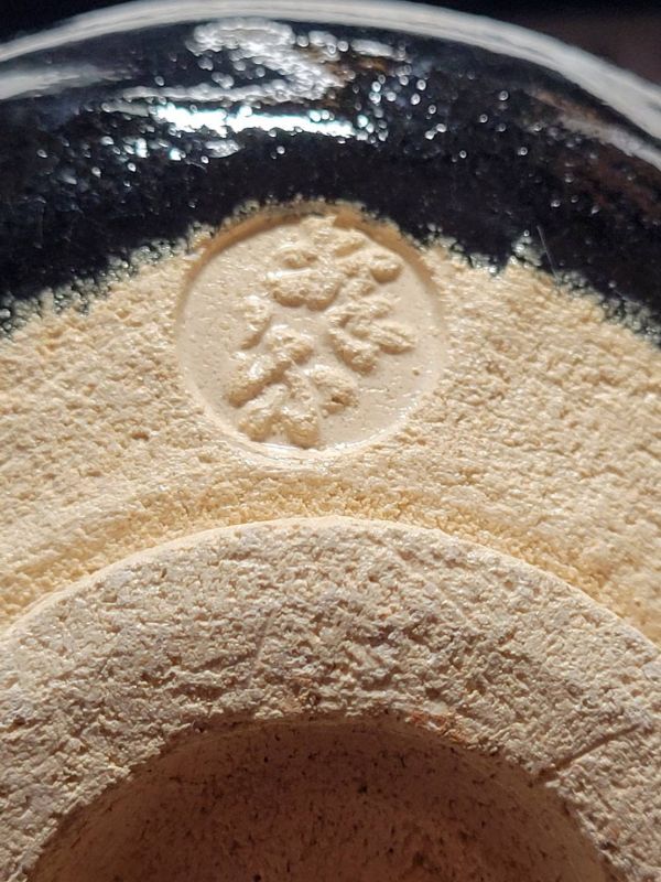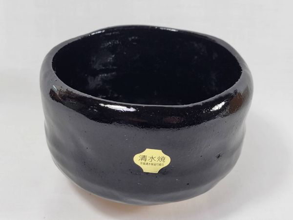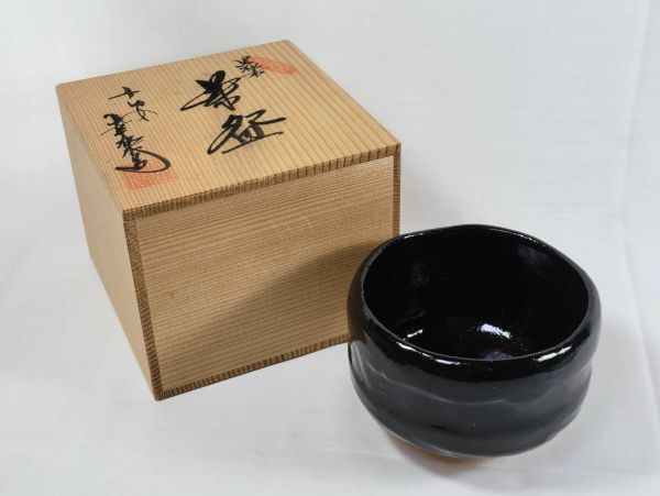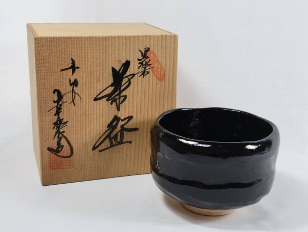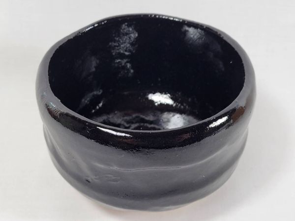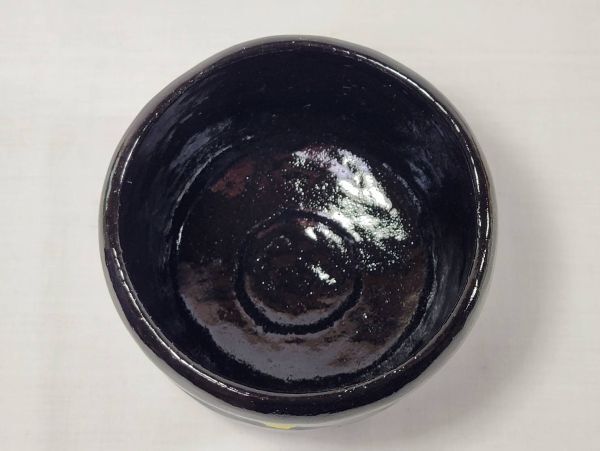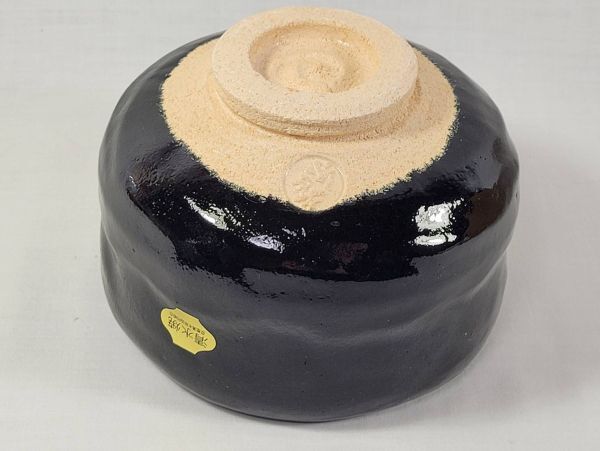 この茶碗は、黒色の釉薬が厚くかけられ、表面には独特の光沢と質感が見られます。