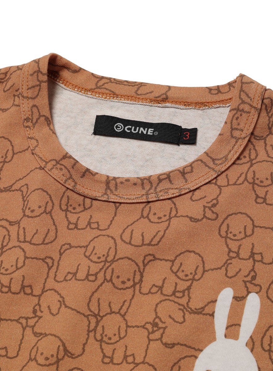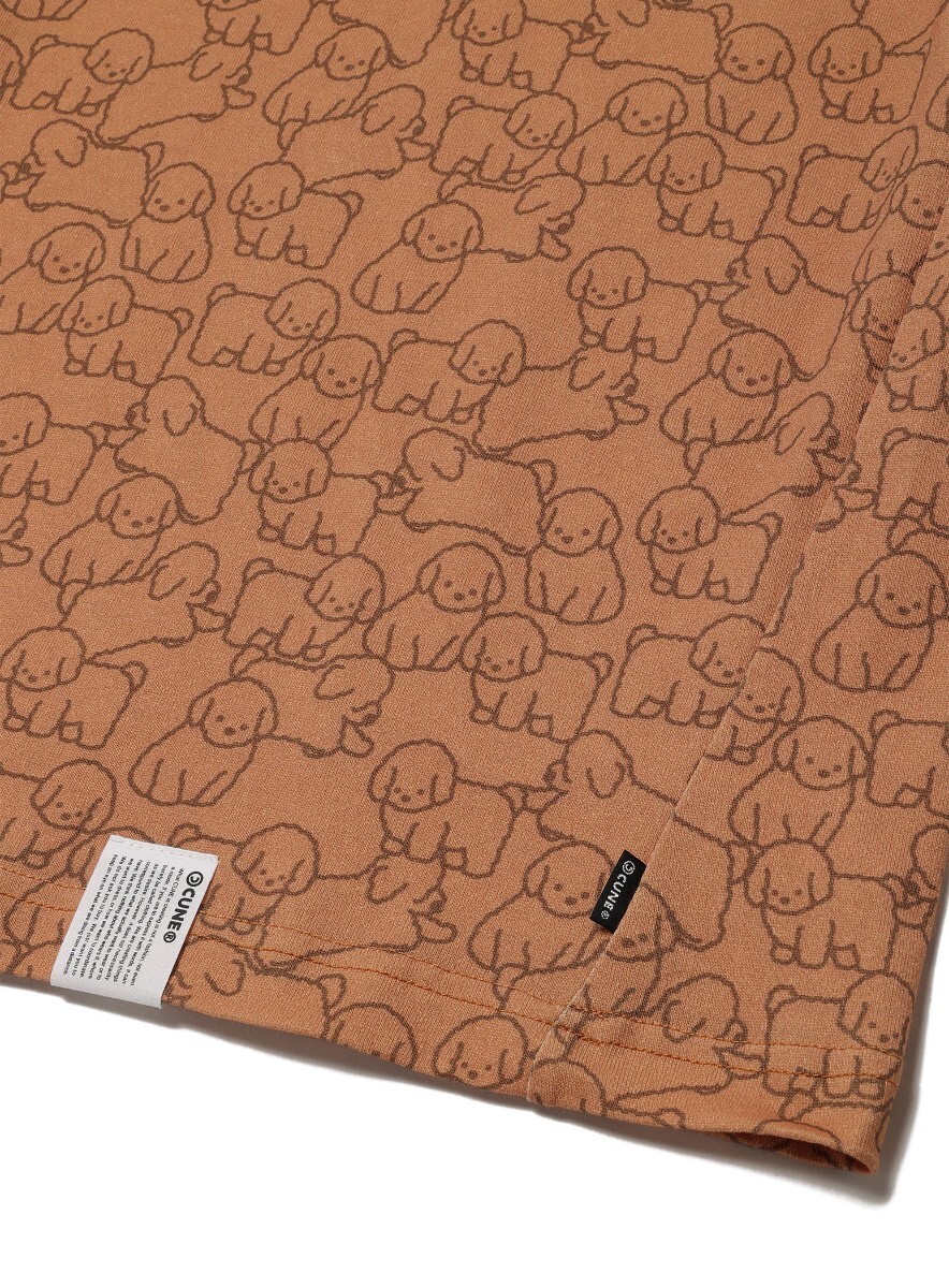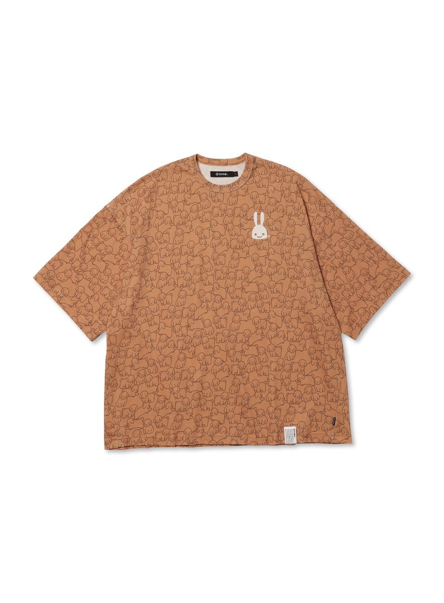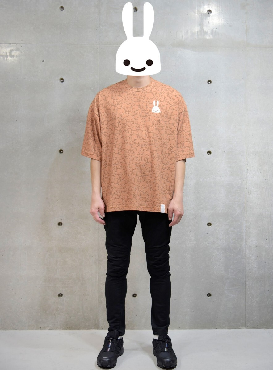 発色の良いオリジナル総柄プリントの天竺を使用したビッグT。襟はバインダー仕様になっており、脇線が少し斜め前に傾斜したパターンになっています。お犬様の軽食が入りそうな小さなポケットが付いています。