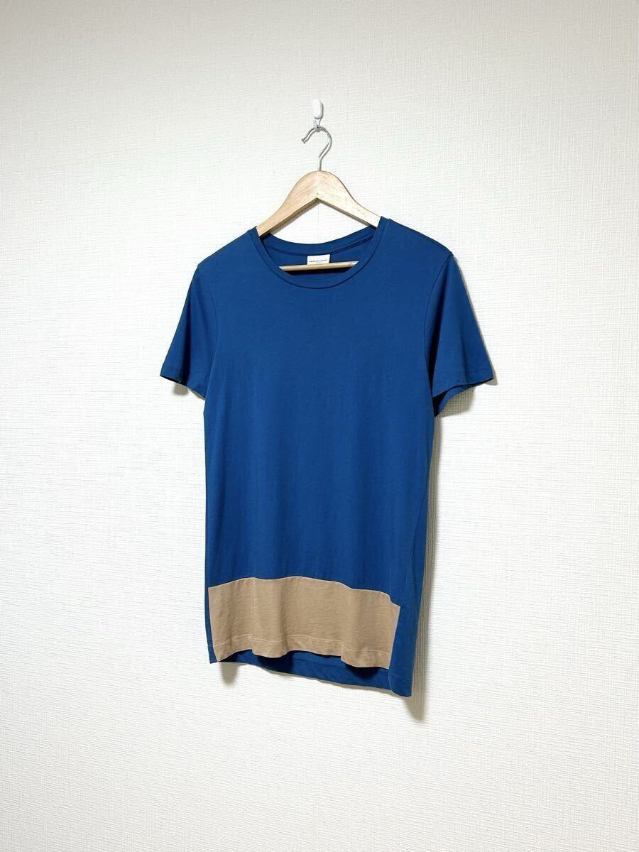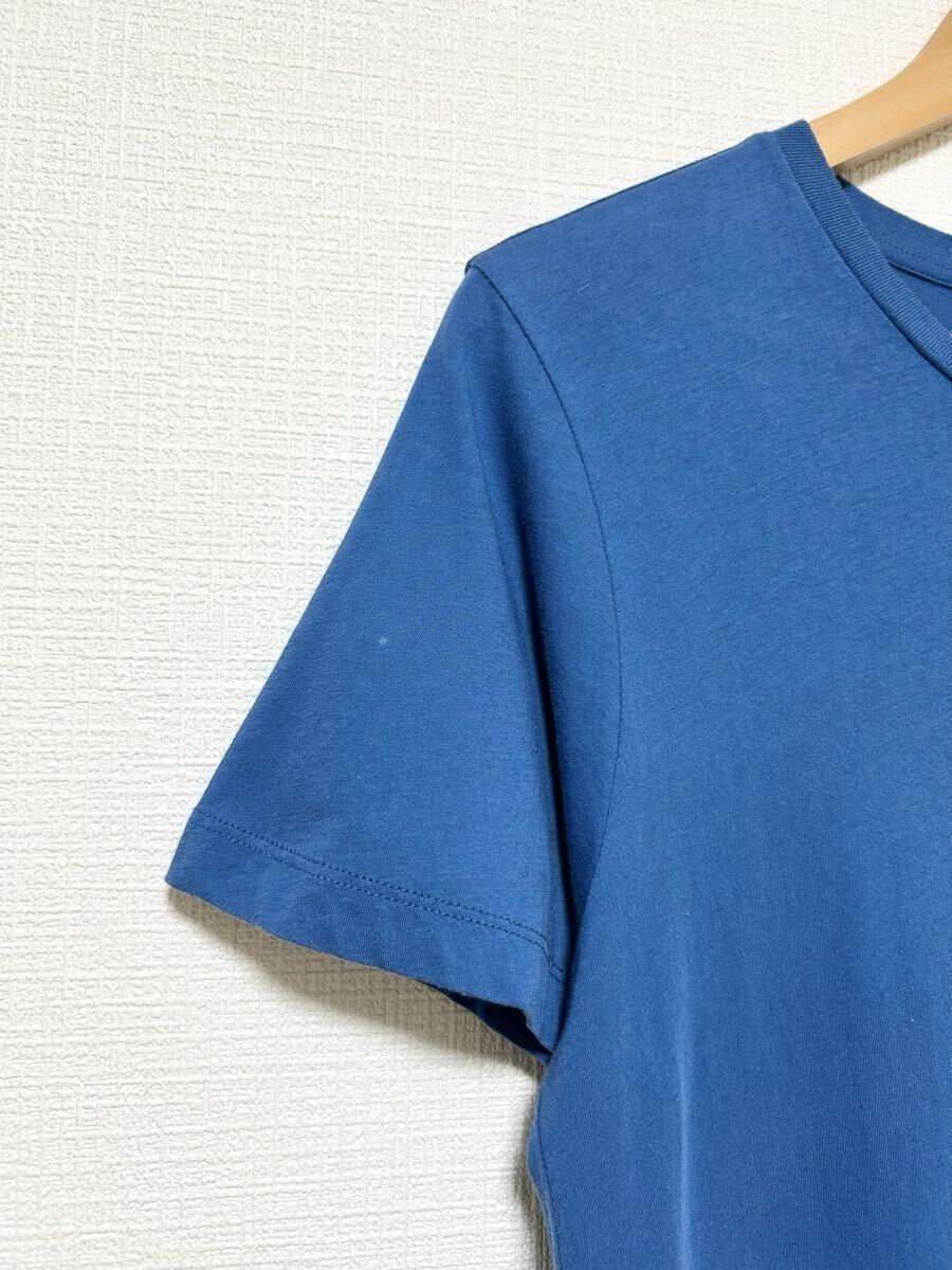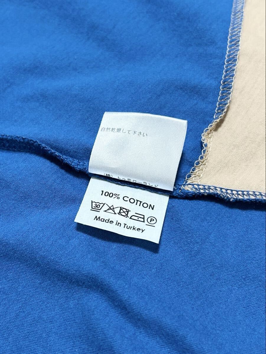 伸縮性のある肌触り滑らかなコットン素材の生地。ブルーとベージュが切り替わったデザインです。秋冬はレイヤードのインナーとして重宝しました。