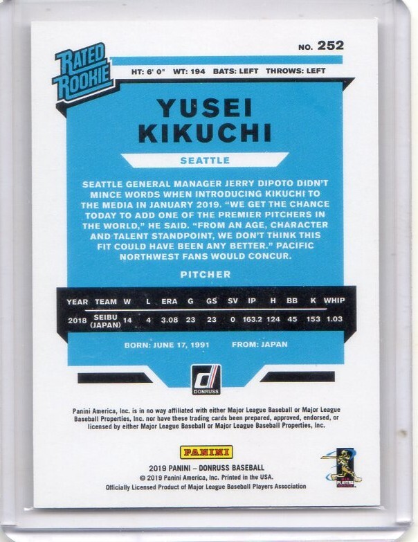 | ★商品説明★ | 2019PANINI DONRUSS RATED ROOKIE SP #252 菊池雄星 MLBルーキー・カード 菊池雄星ファンの方、是非どうぞ! |