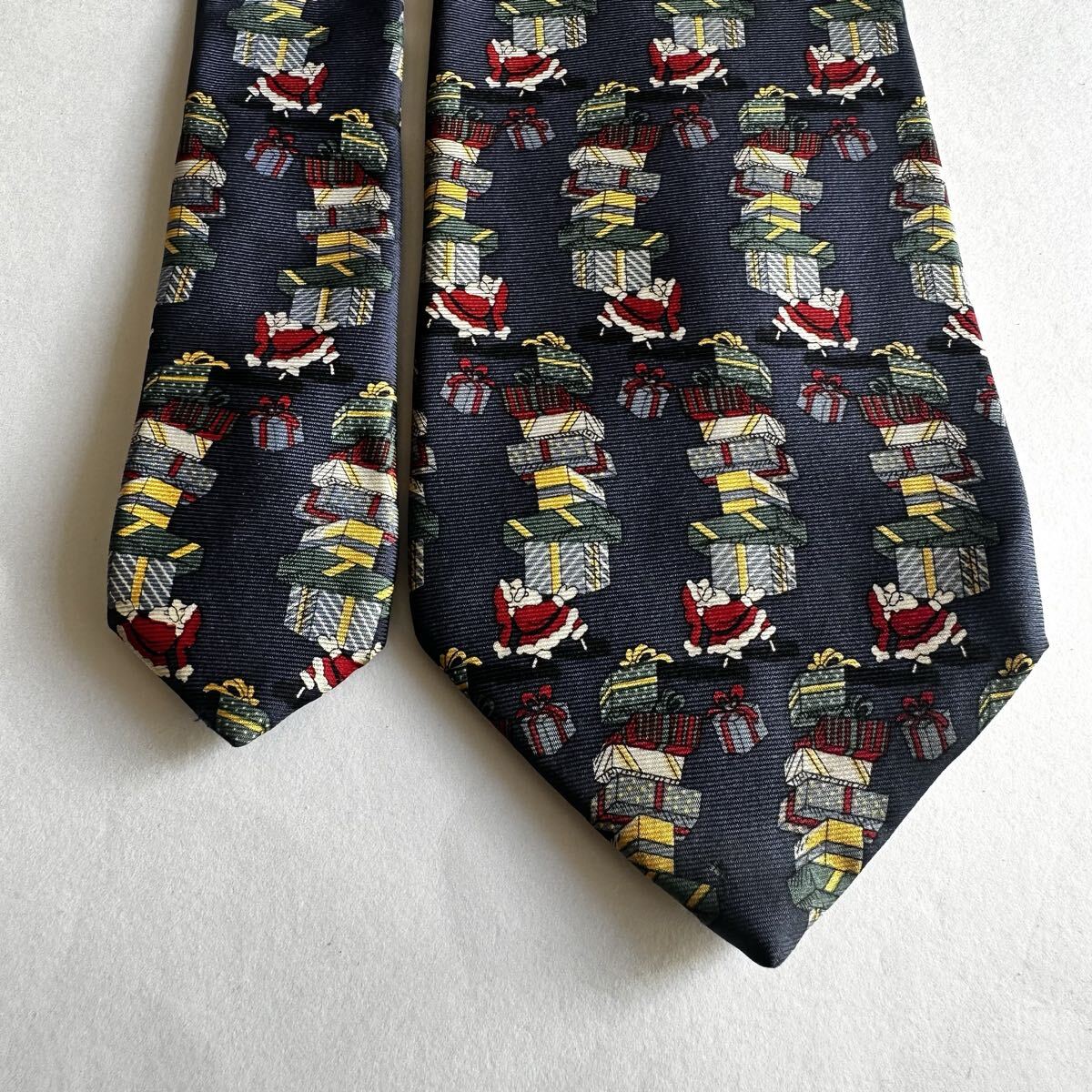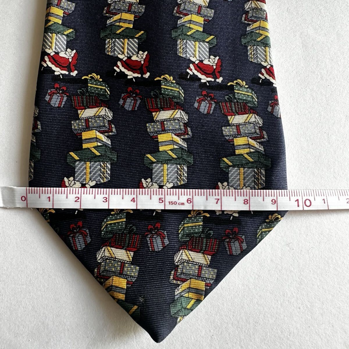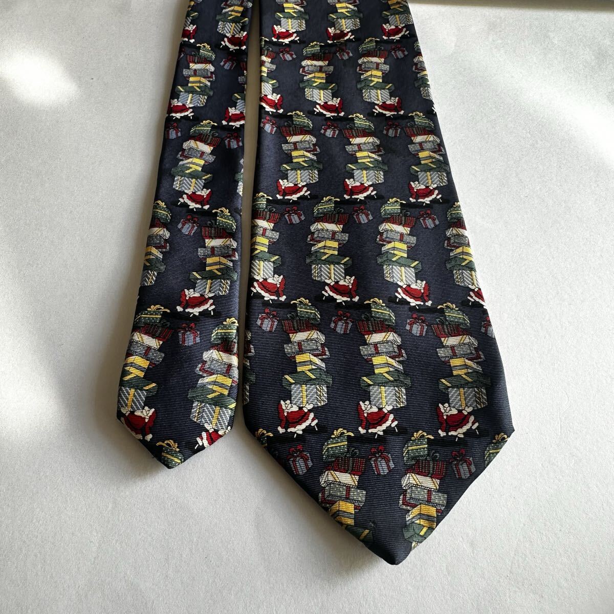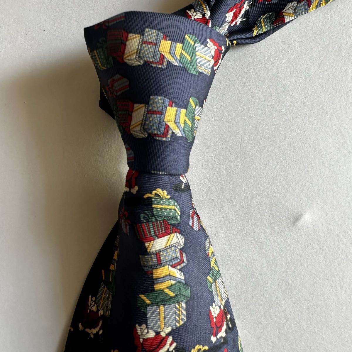 ネイビー地に緑赤黄色のプレゼントデザインのシルクネクタイ