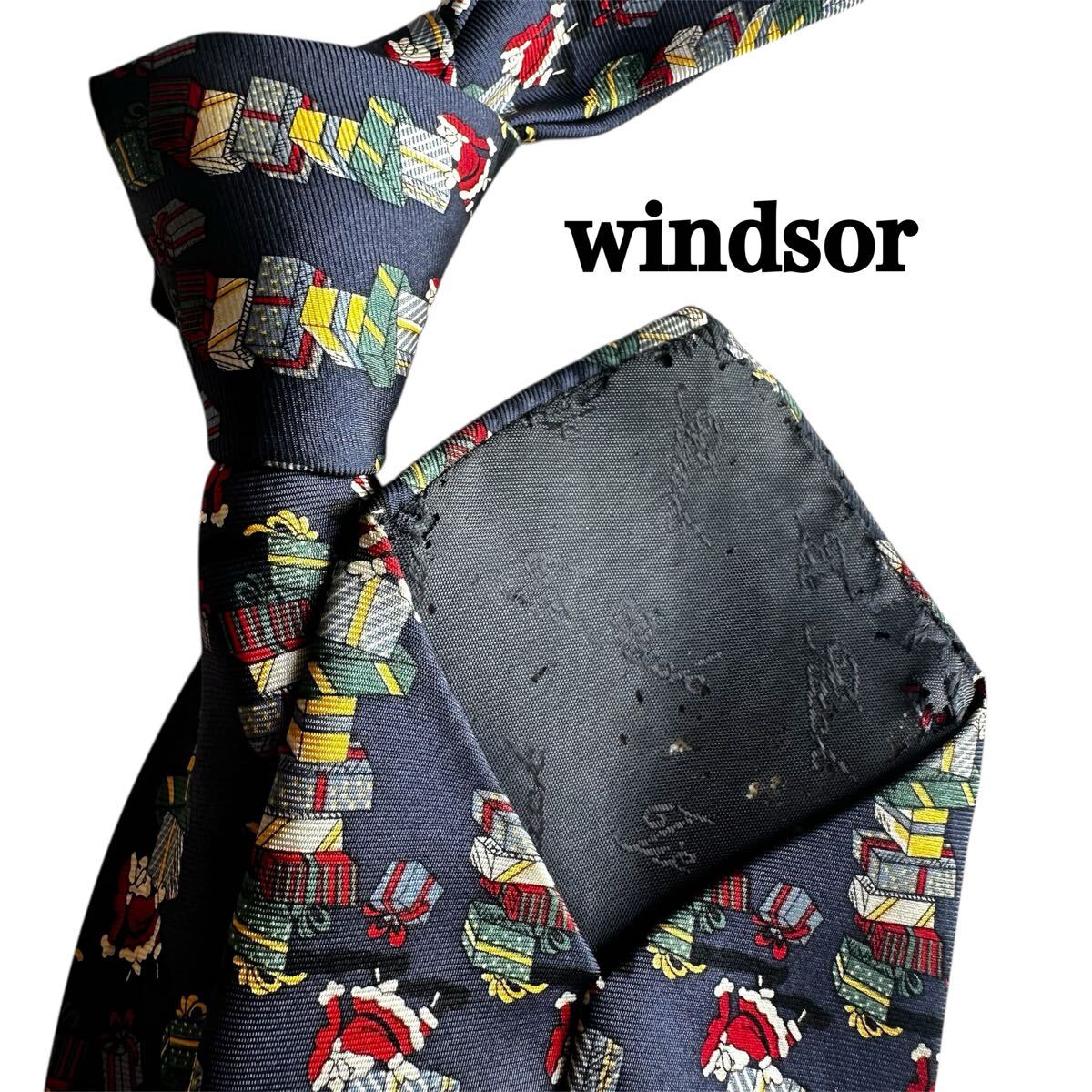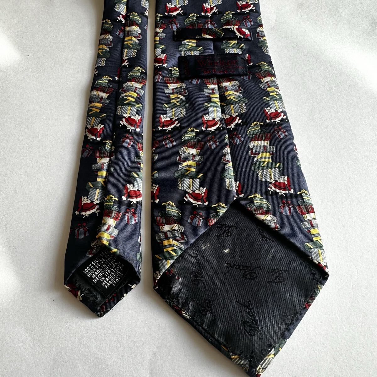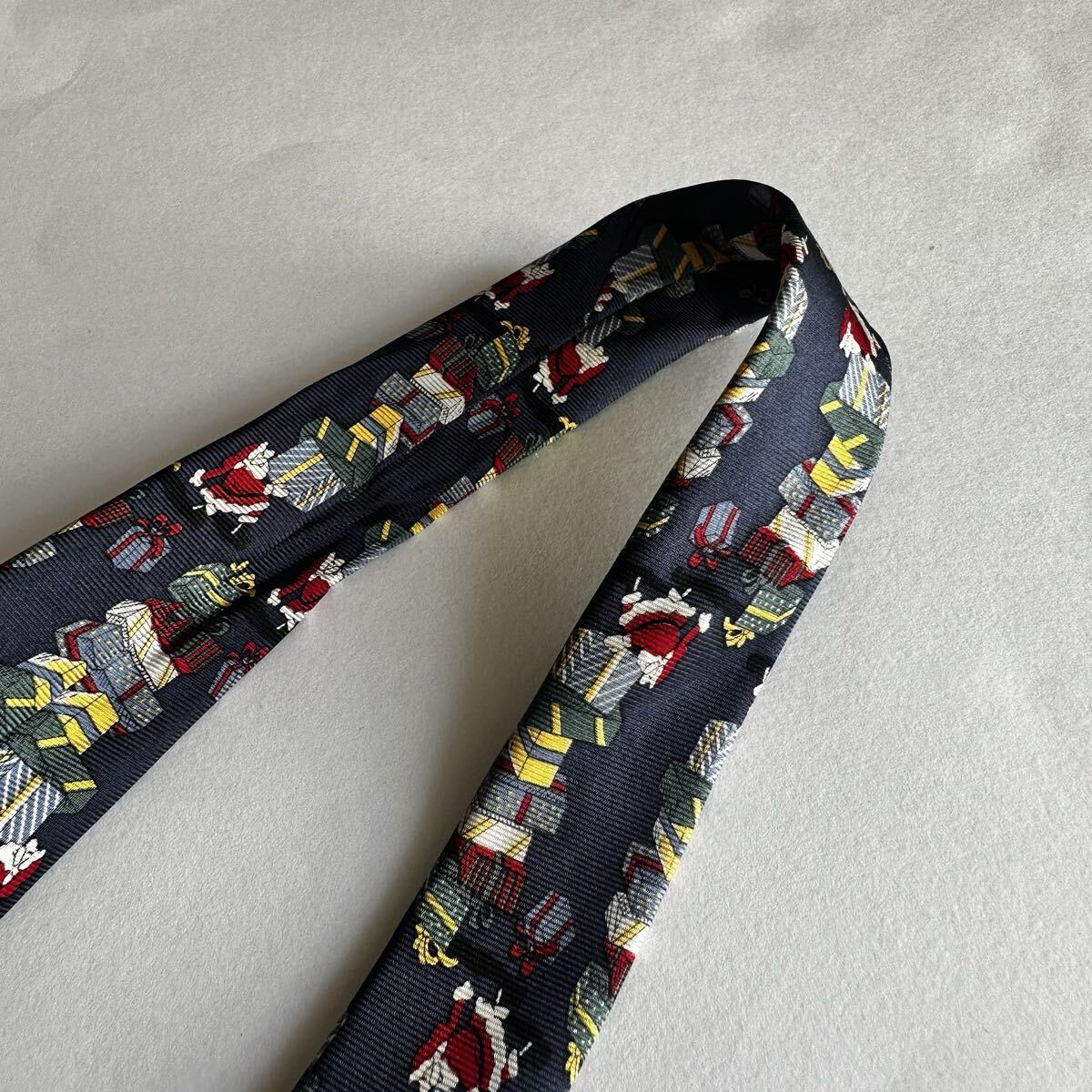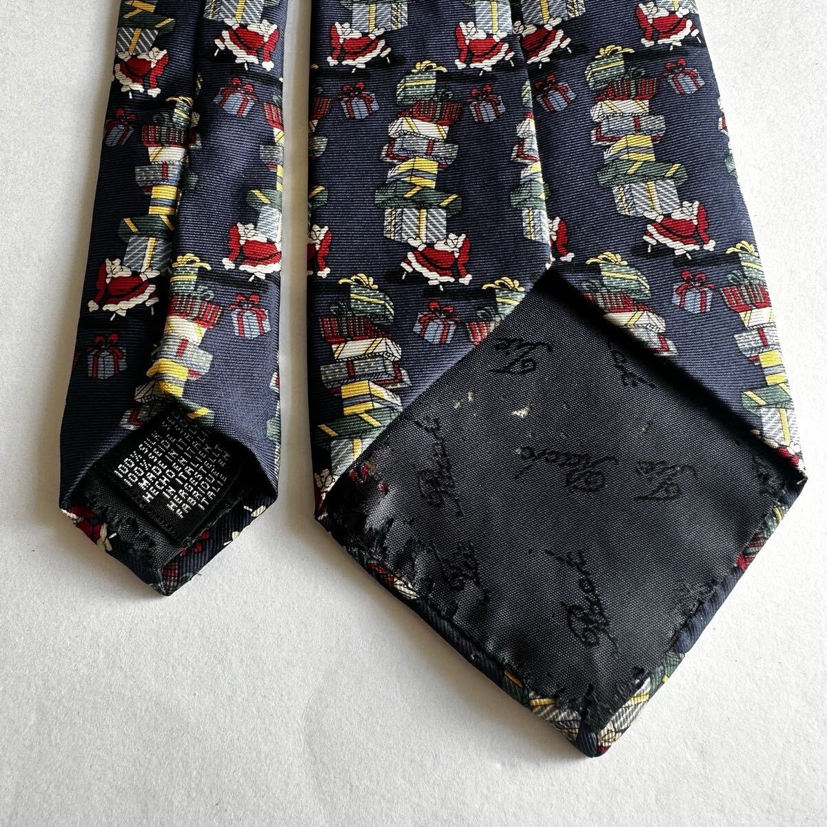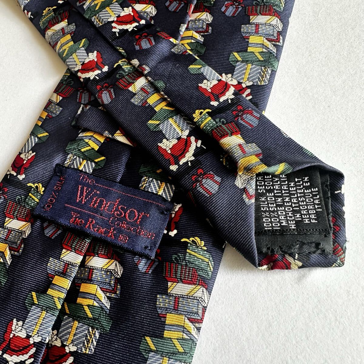 ネイビー地に緑赤黄色のプレゼントデザインのシルクネクタイ