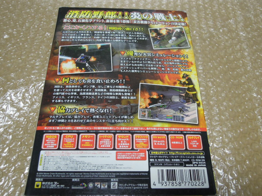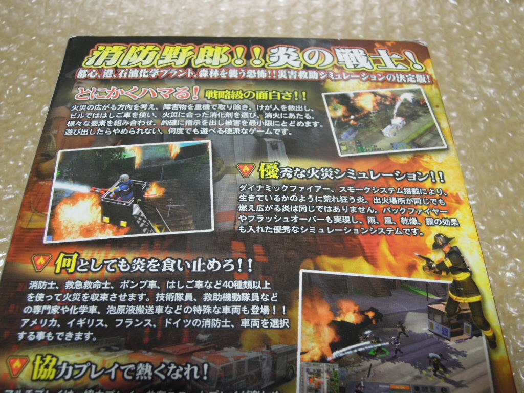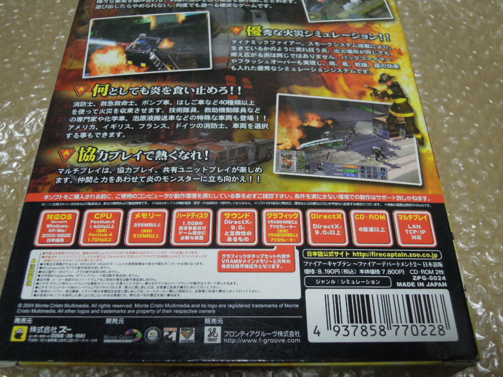 対応OS:Windows98/2000/Me/XP 2005年発売 対応OSで動作確認済みです。 Monte Cristo開発の消防リアルタイムストラテジー(RTS)「ファイア・デパートメント」シリーズ2作目です。 日本語字幕による日本語対応となっています。 アメリカ・フランス・イギリス・ドイツ、各国の消防士の服装や、車両についても色や模様・形状を再現。 クラスA(木、紙、繊維、樹脂)~D(アルミニウムやマグネシウム、ナトリウムなどの可燃性金属)の火災の性質があり、それぞれに応じた消火法や消火剤を使用する必要もあり、多彩なユニットと様々なステージ、迫りくるイベントにより緊迫感のあるプレイが楽しめます。 LANやインターネットを介して最大4名で遊べる「マルチプレイ」モードが追加されています。 | ||||
