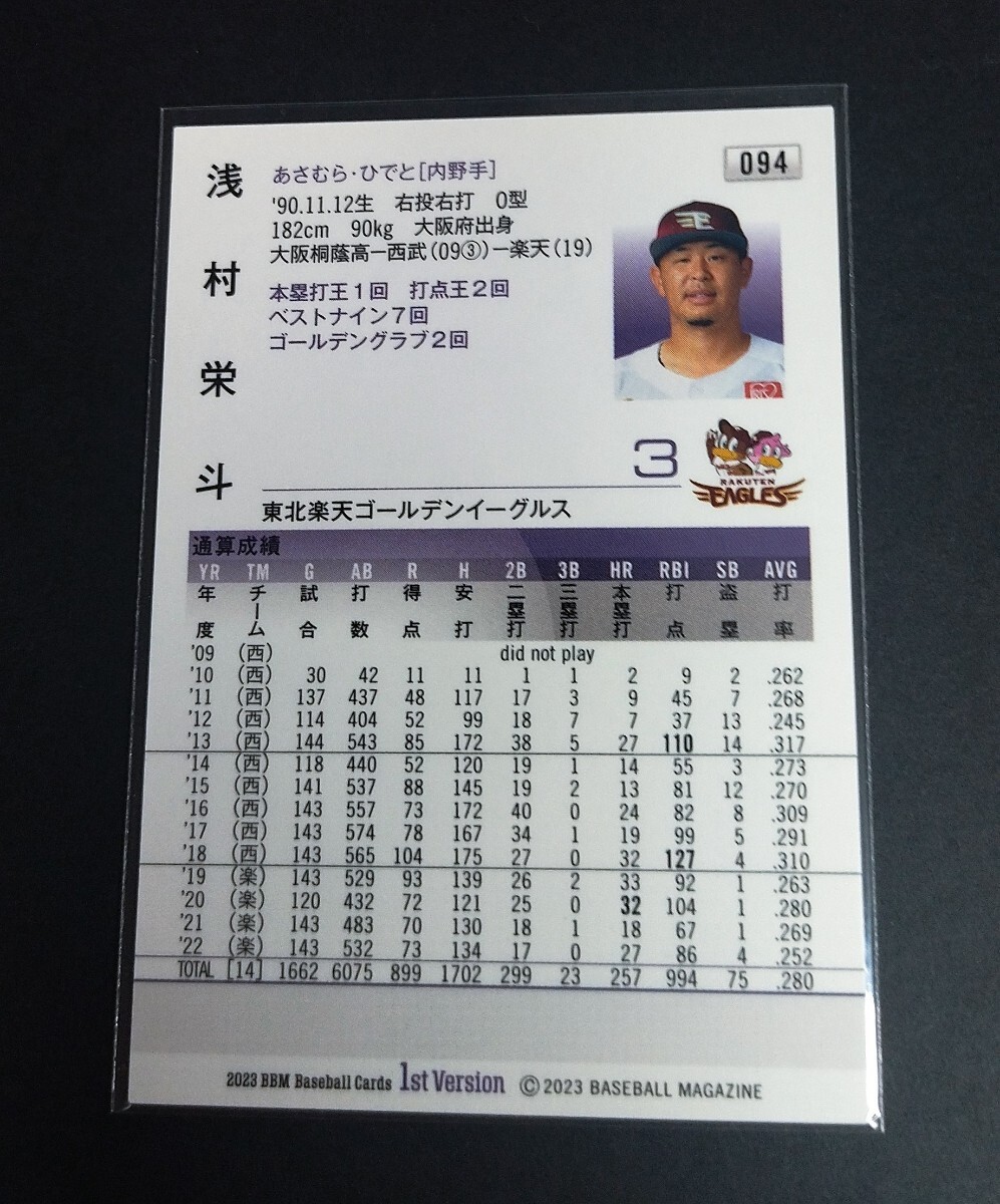 2023年BBM 1st 浅村栄斗(楽天)銀箔サイン入り。No,094。