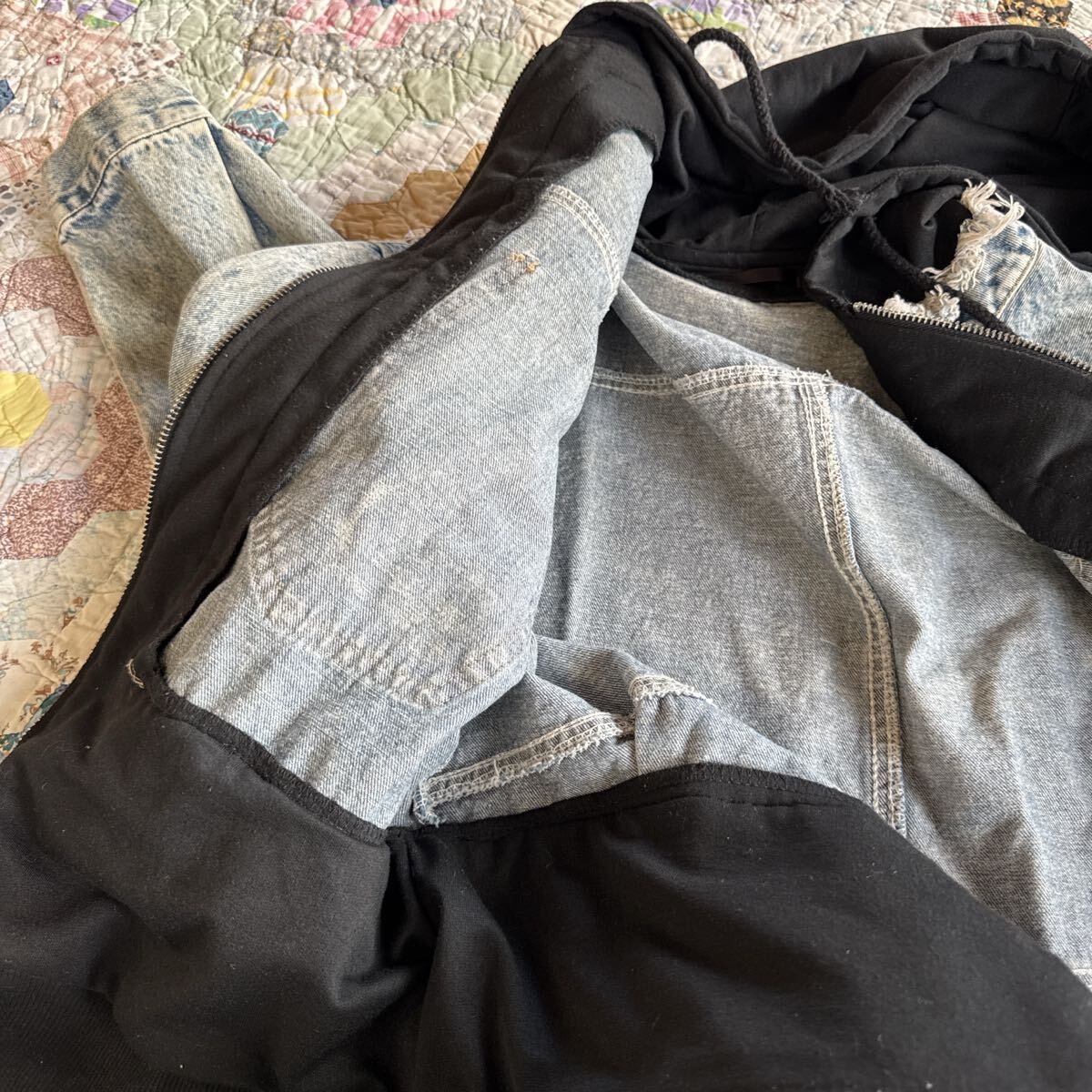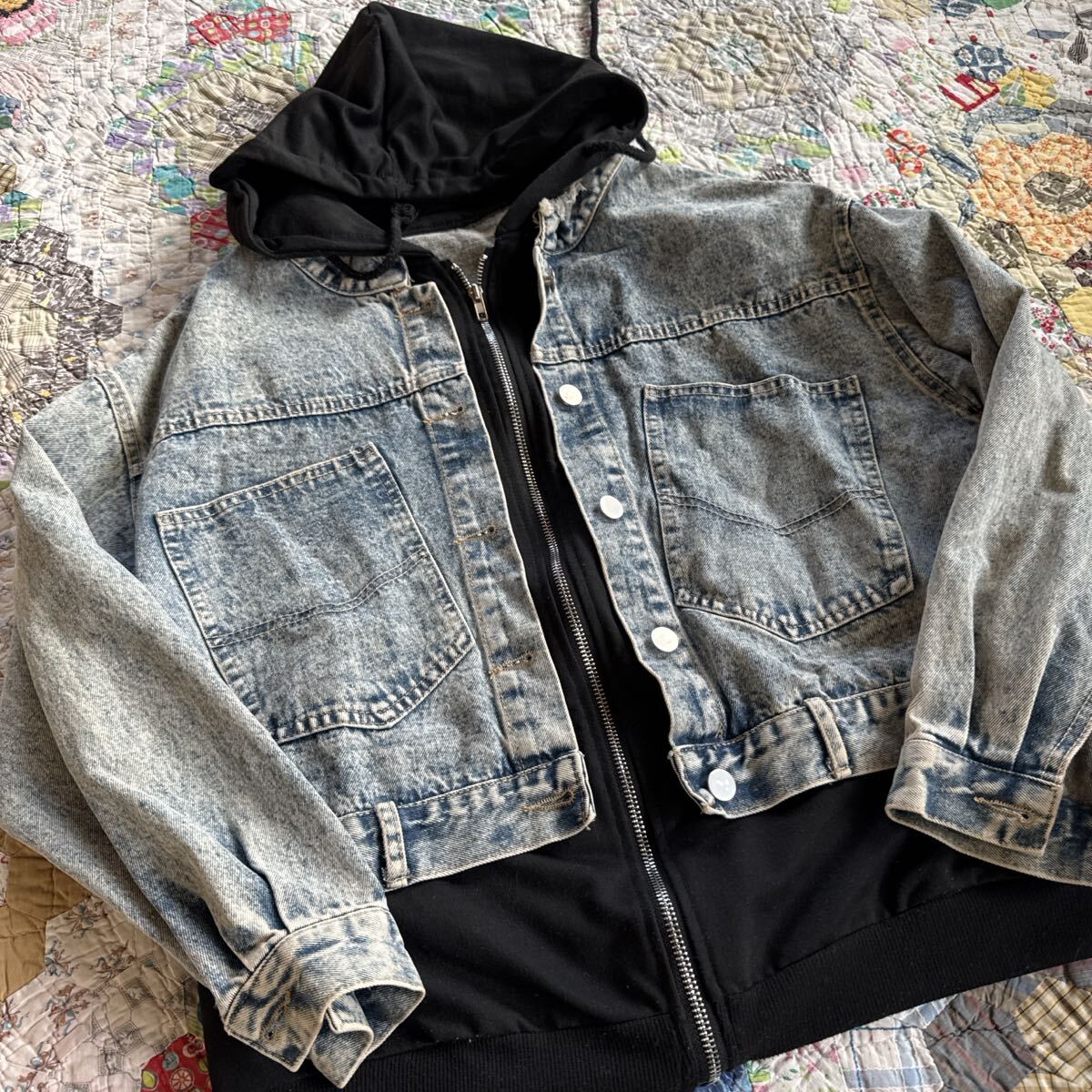 程よくラフなフード付きデニムジャケット ゆったりしたサイズ感が嬉しいデニムジャケットです。余裕があるサイズ感なので、デニムジャケット特有の肘のツッパリ感がなくすごく動きやすくなっております。フードがあるデザインなので程よいラフさでお楽しみいただけます